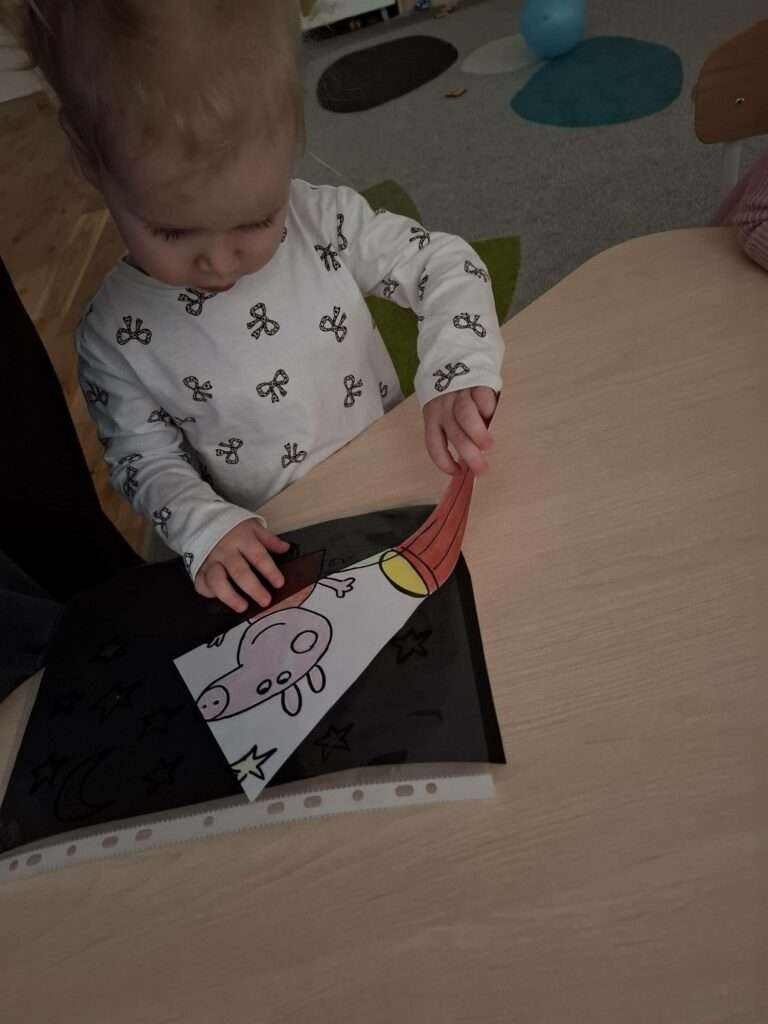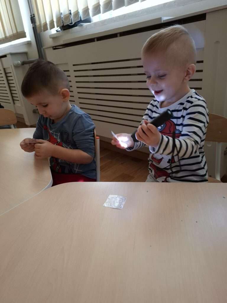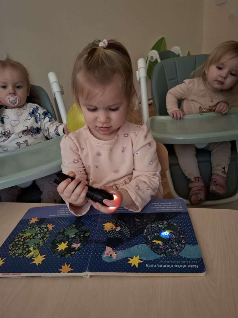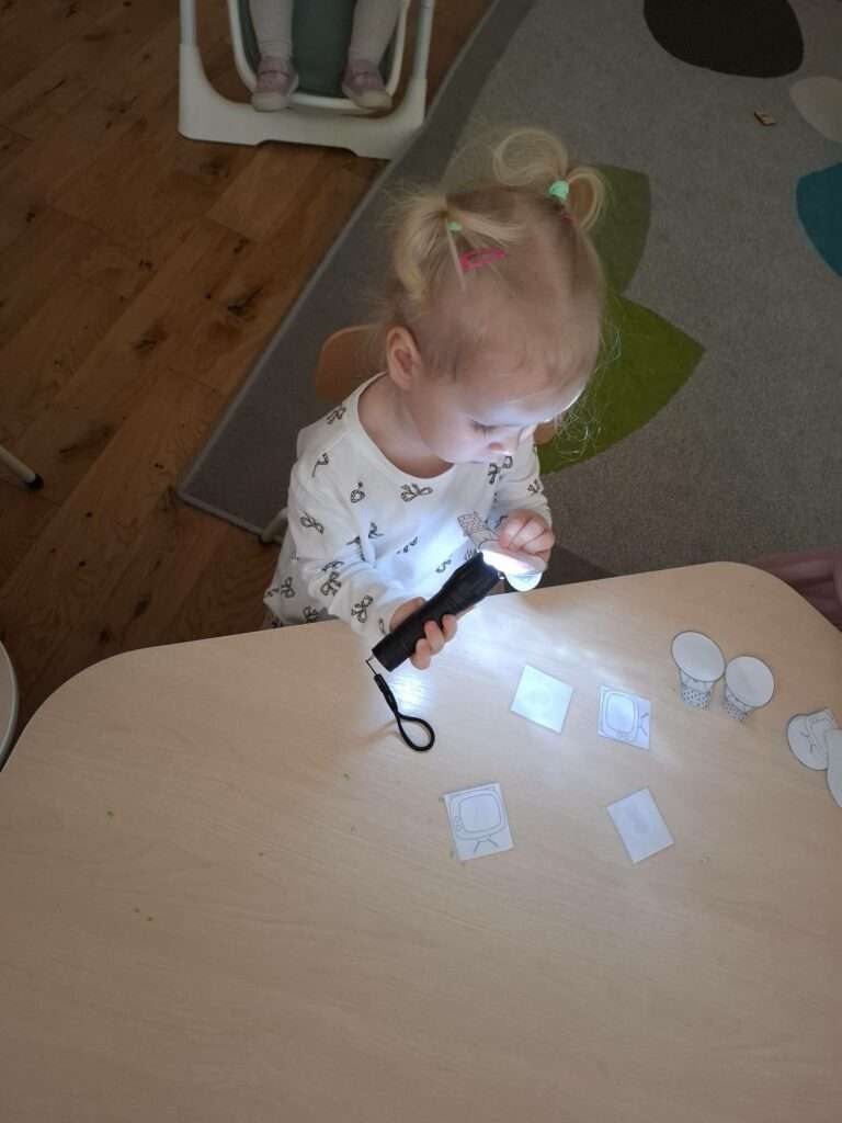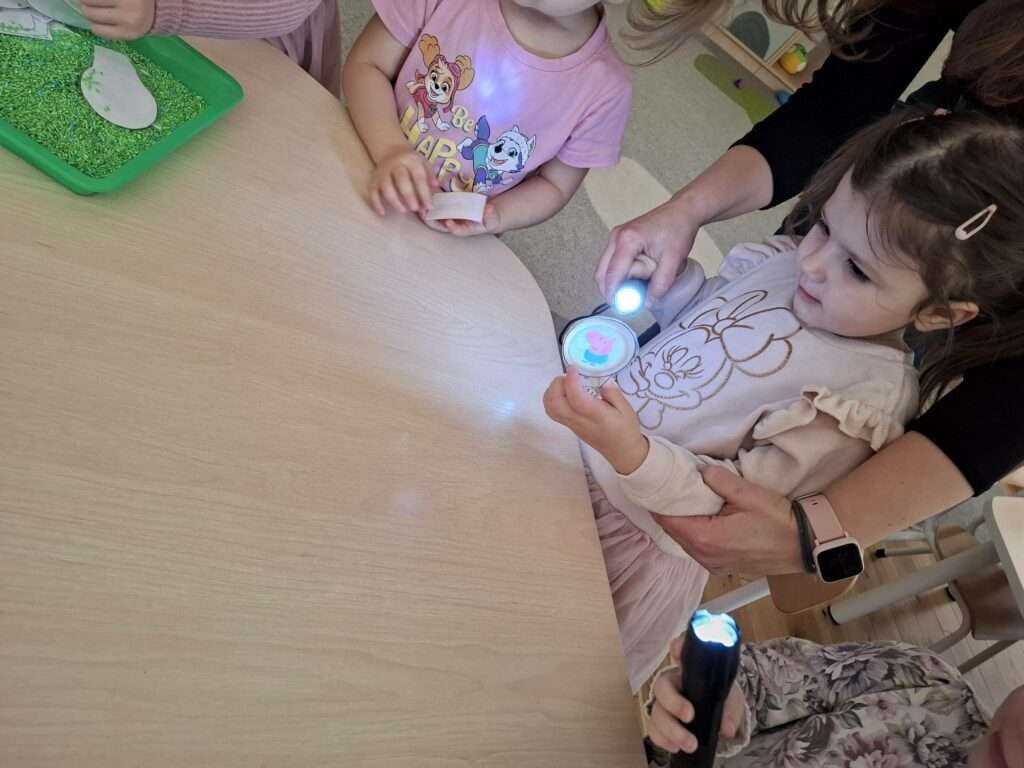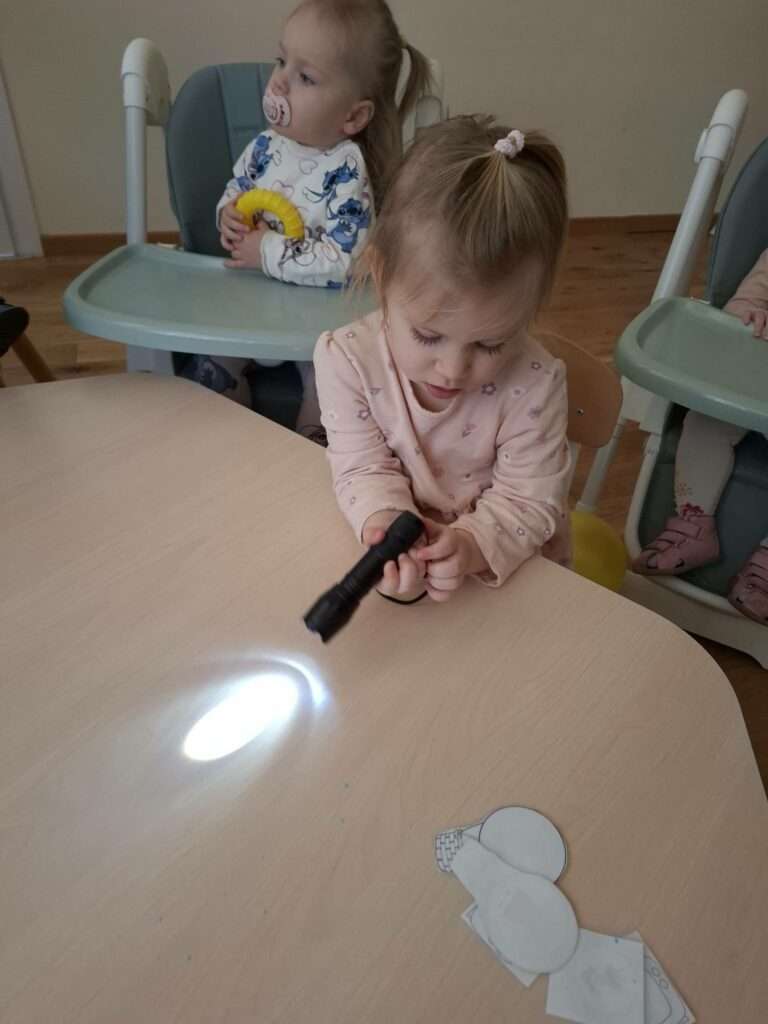 Maluszki bawiły się w „Ukryte obrazki”, podświetlając latarką białe kartki, na których pojawiały się niespodzianki . W zabawie „Zaświeć latarkę” kierowały światło papierowej latarki na koszulki do segregatora, odkrywając ukryte ilustracje.