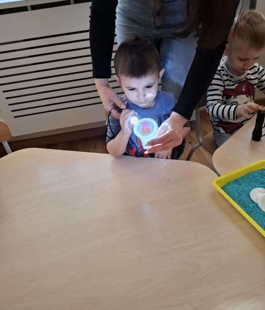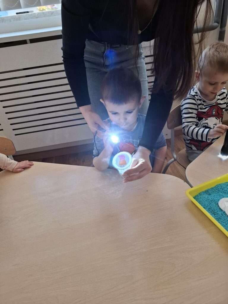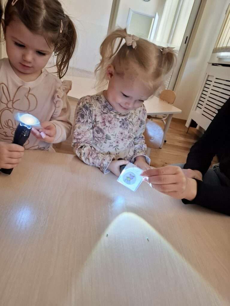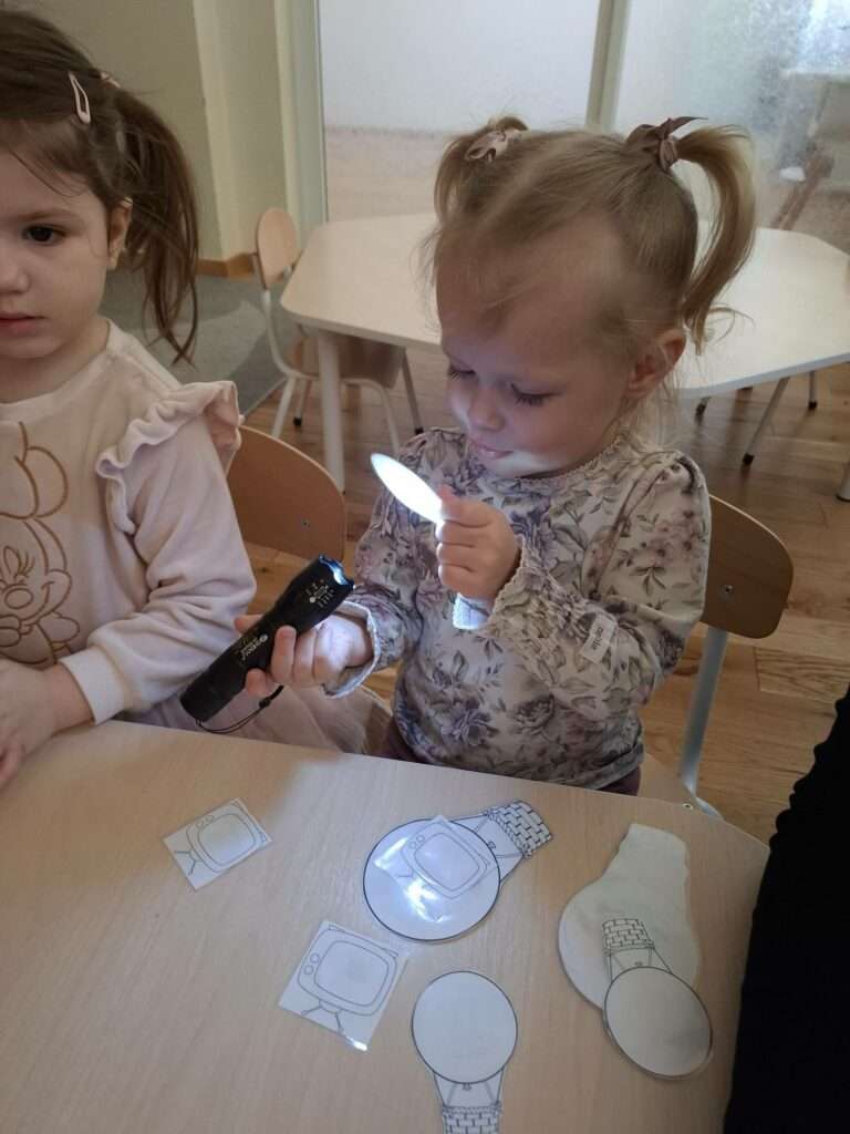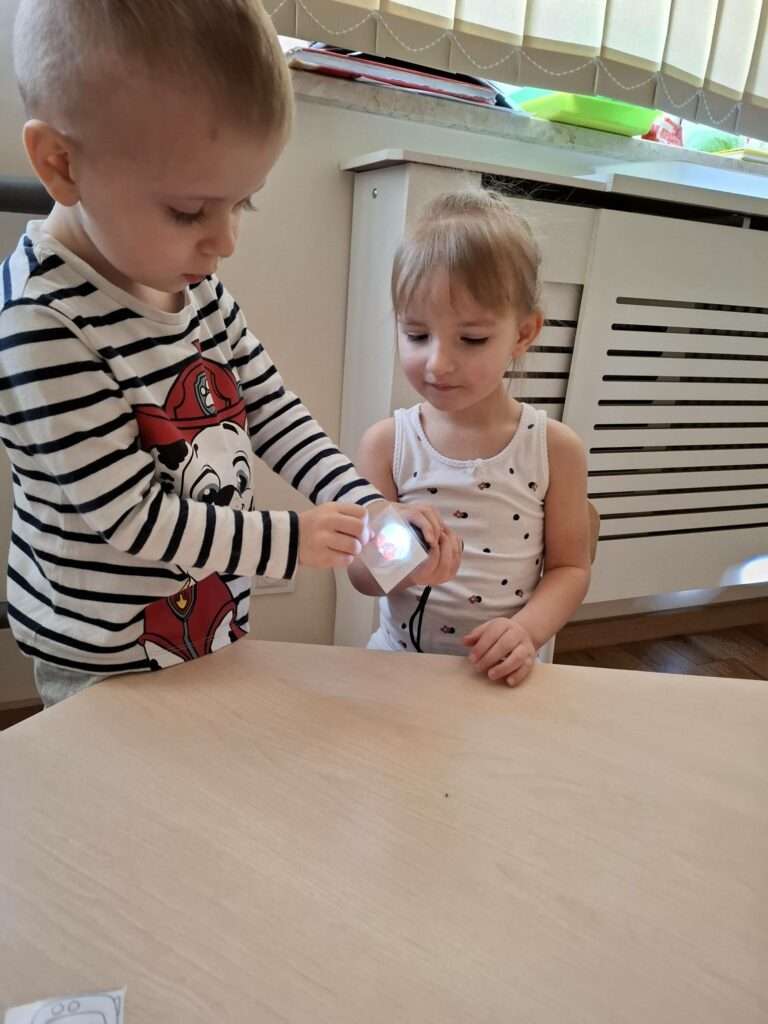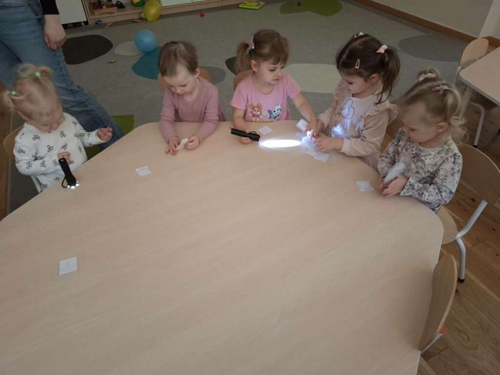 Maluszki bawiły się w „Ukryte obrazki”, podświetlając latarką białe kartki, na których pojawiały się niespodzianki . W zabawie „Zaświeć latarkę” kierowały światło papierowej latarki na koszulki do segregatora, odkrywając ukryte ilustracje.