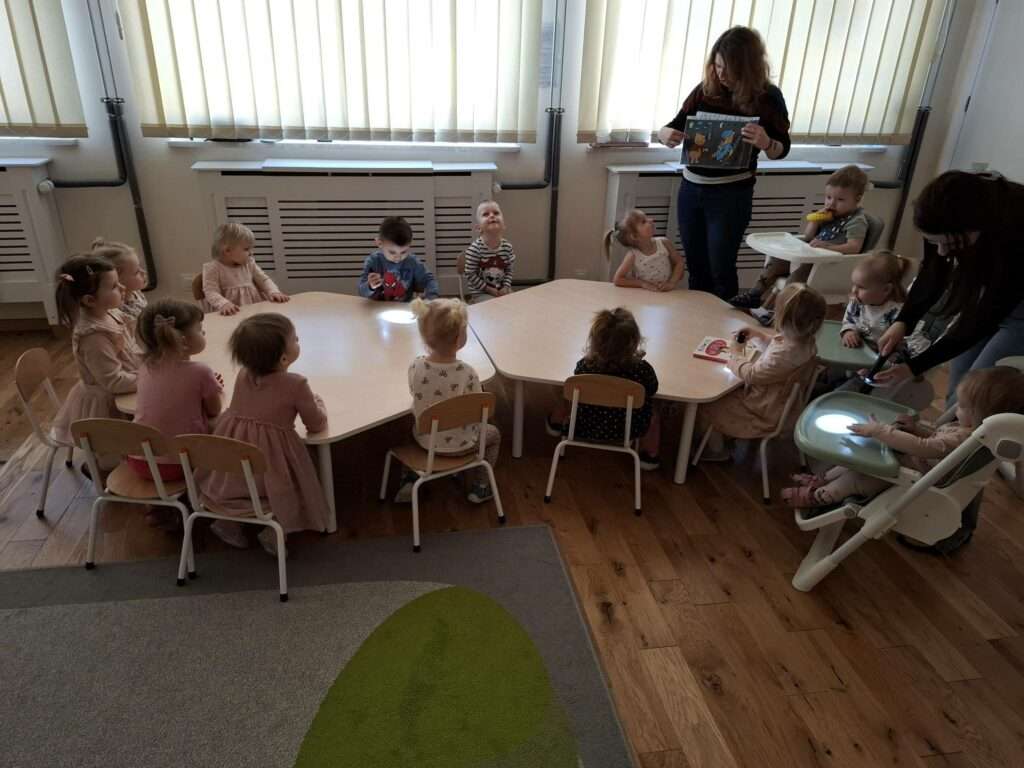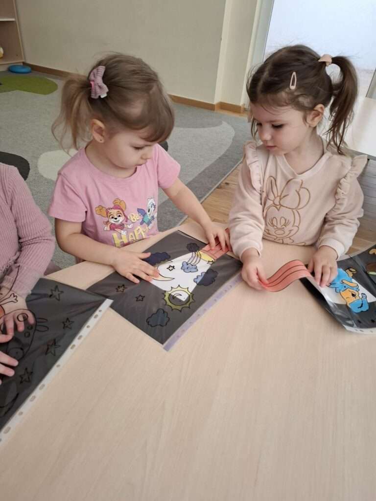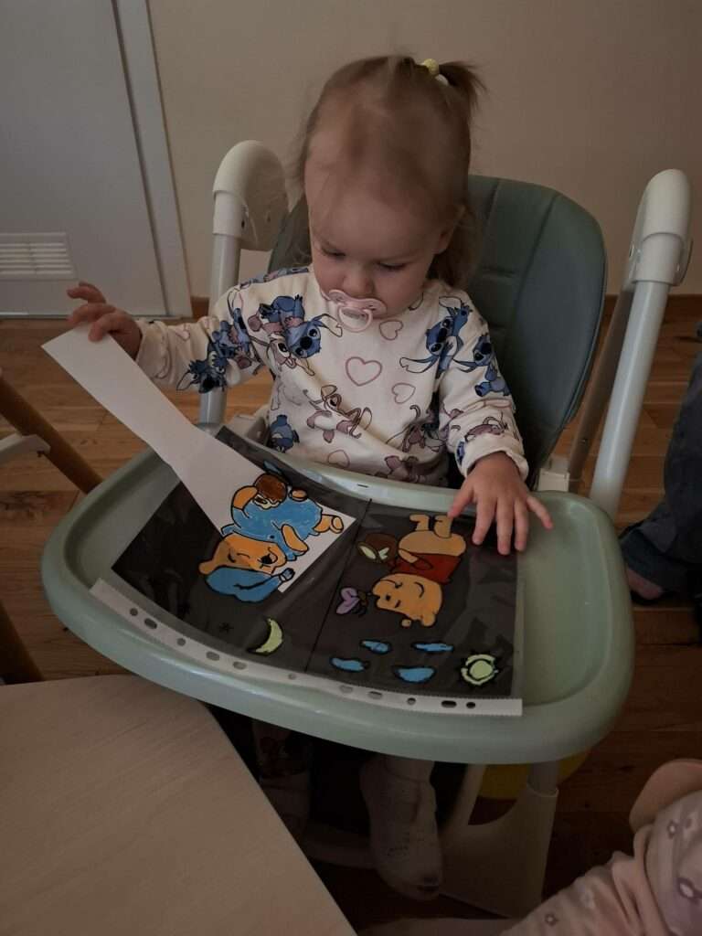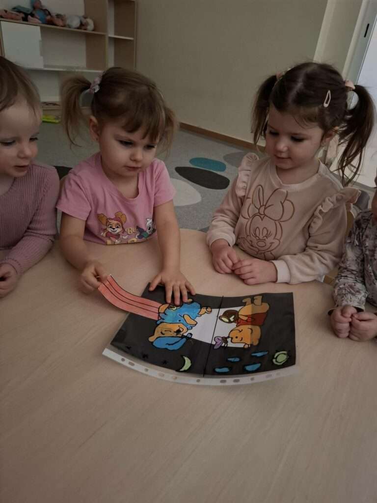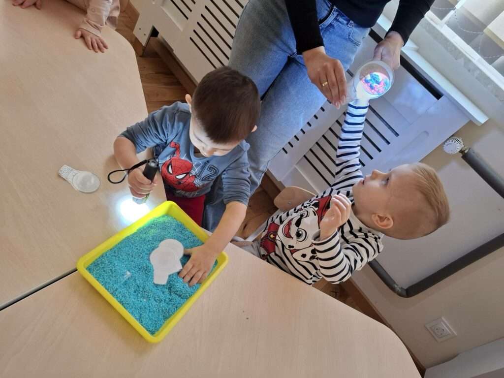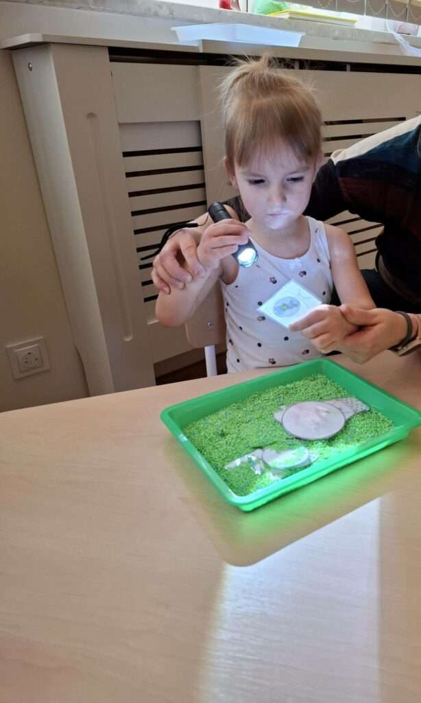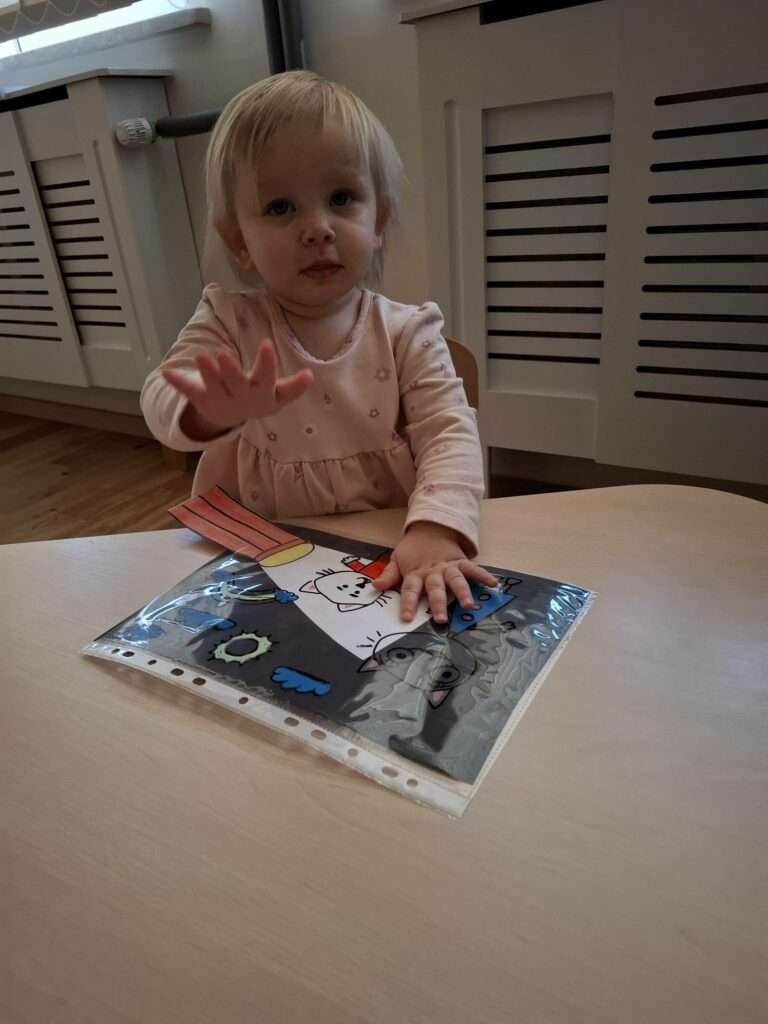 Maluszki bawiły się w „Ukryte obrazki”, podświetlając latarką białe kartki, na których pojawiały się niespodzianki . W zabawie „Zaświeć latarkę” kierowały światło papierowej latarki na koszulki do segregatora, odkrywając ukryte ilustracje.