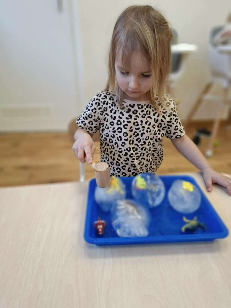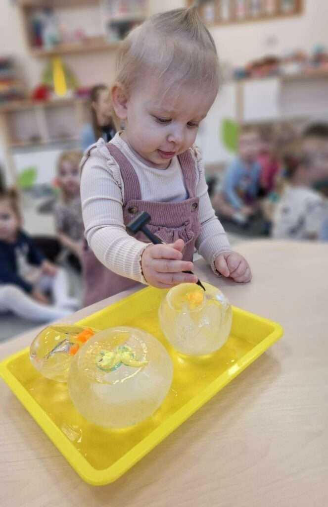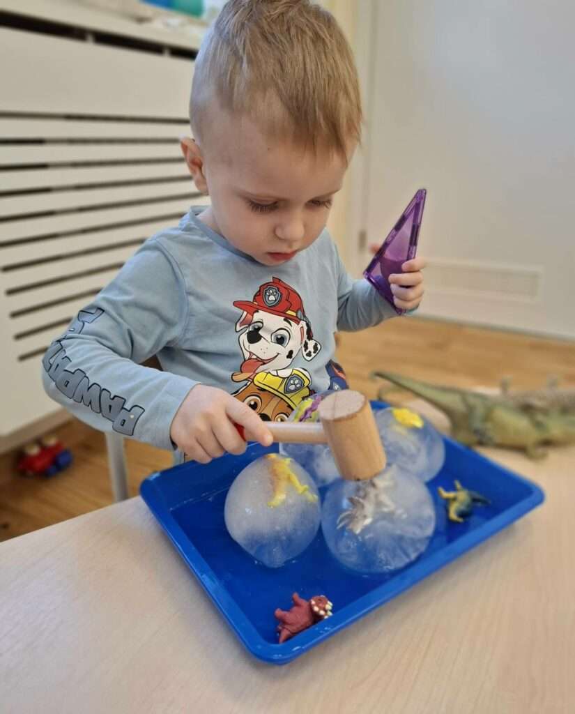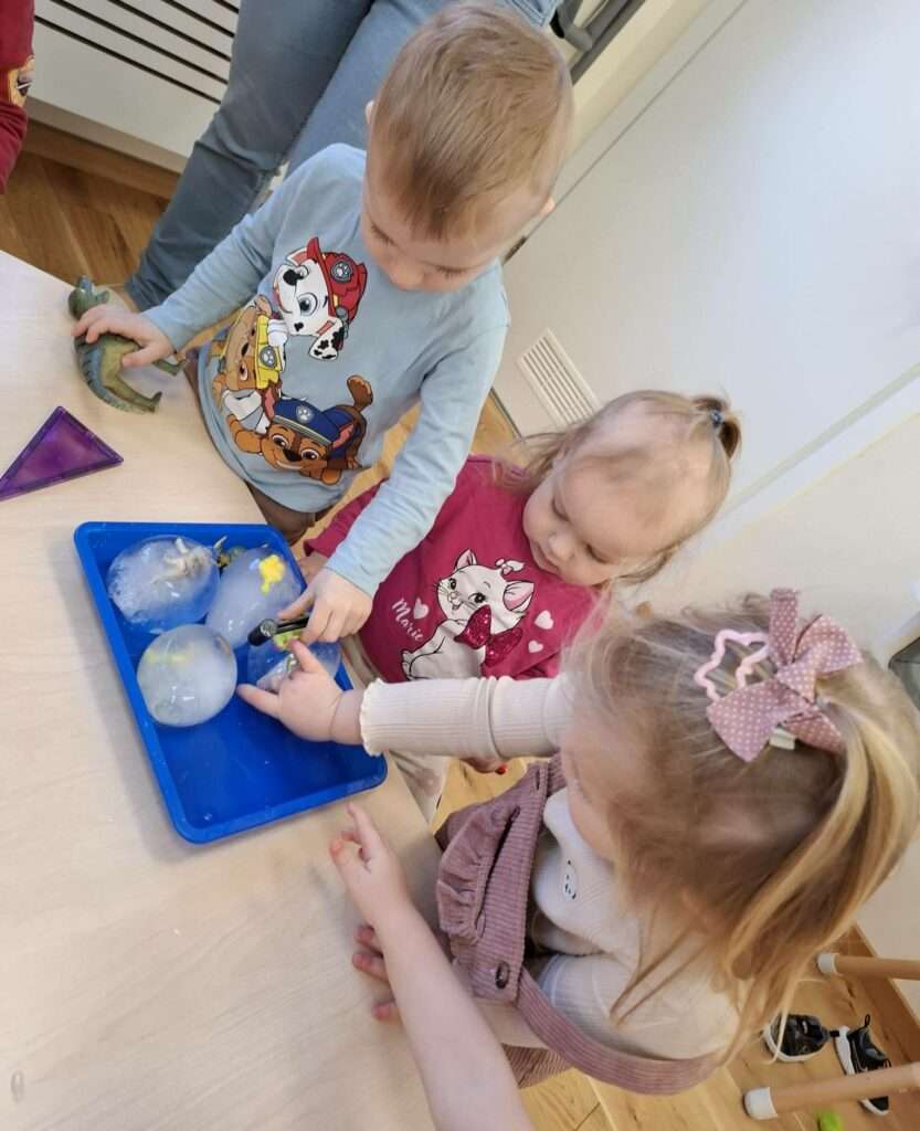 Ogromną atrakcją było również wydobywanie figurek dinozaurów z lodowych jaj. Ta aktywność wymagała od dzieci dużo siły w rączkach, ale także cierpliwości i wytrwałości. Maluszki świetnie poradziły sobie z tym wyzwaniem, a radość po „wykluciu” dinozaura była bezcenna.