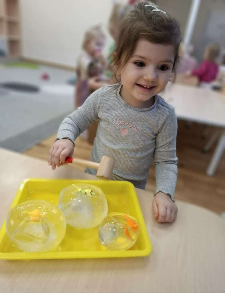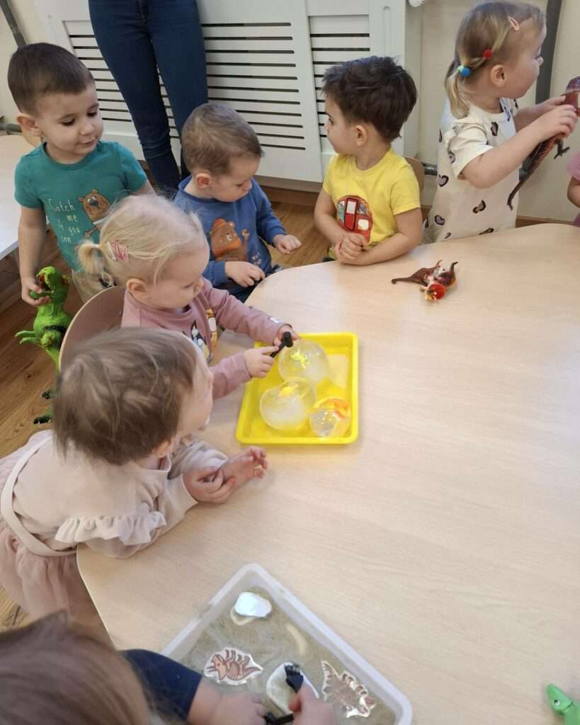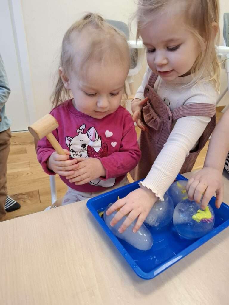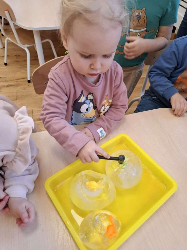 Ogromną atrakcją było również wydobywanie figurek dinozaurów z lodowych jaj. Ta aktywność wymagała od dzieci dużo siły w rączkach, ale także cierpliwości i wytrwałości. Maluszki świetnie poradziły sobie z tym wyzwaniem, a radość po „wykluciu” dinozaura była bezcenna.