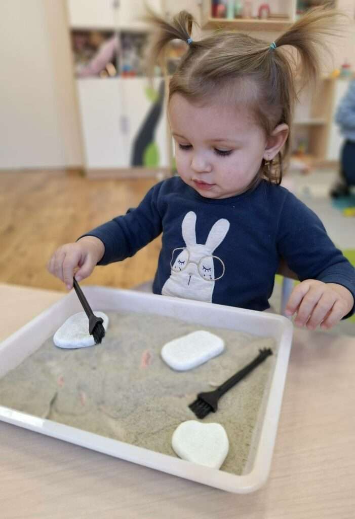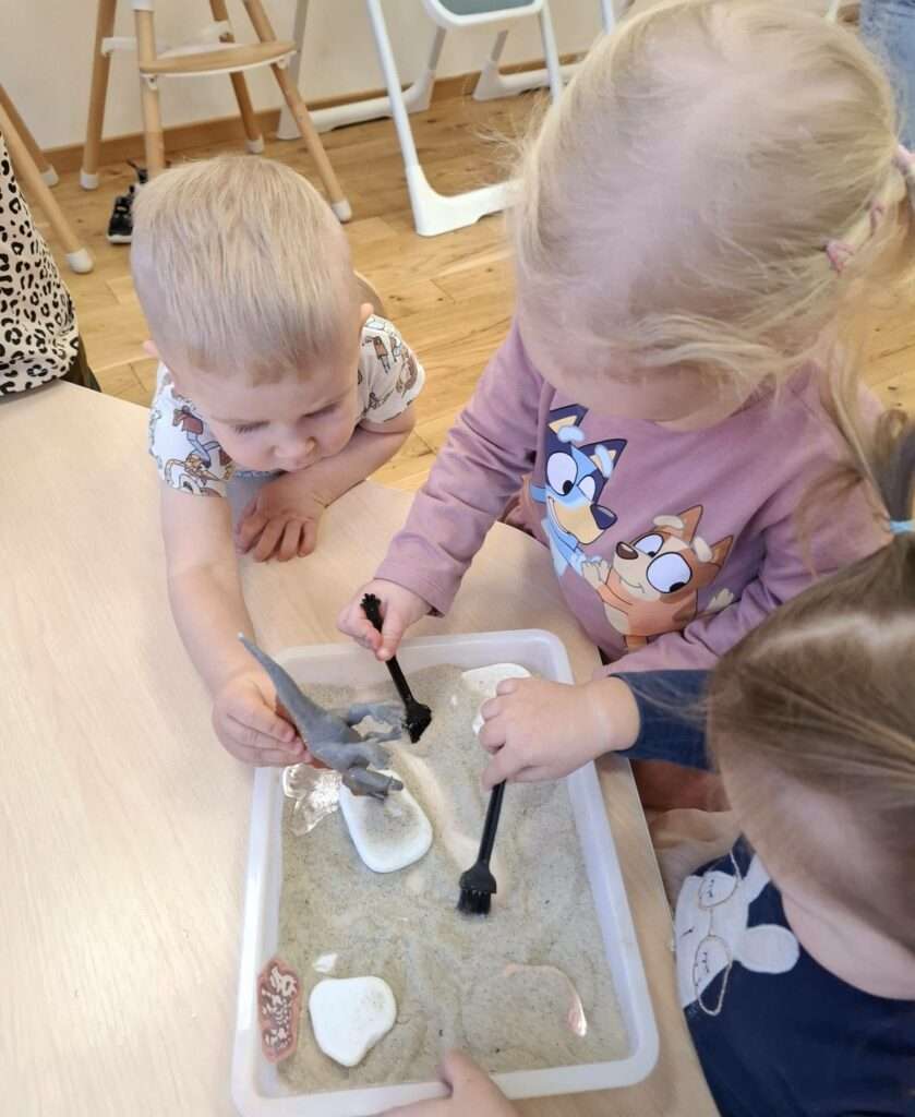 Nasze maluszki zamieniły się w małych paleontologów. Z pomocą pędzelków bardzo starannie odkopywały z piasku „szczątki” dinozaurów. Było przy tym mnóstwo skupienia, delikatności i ekscytacji przy każdym odkryciu.