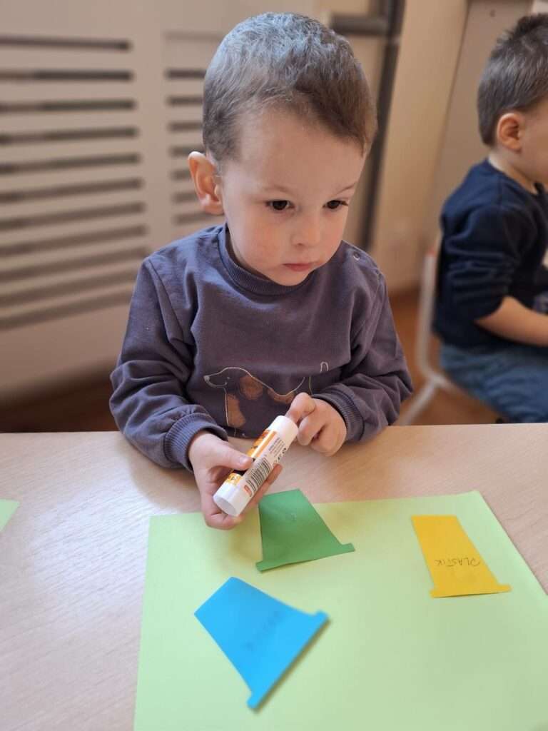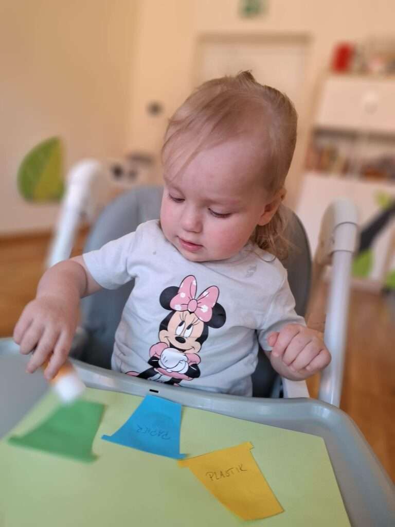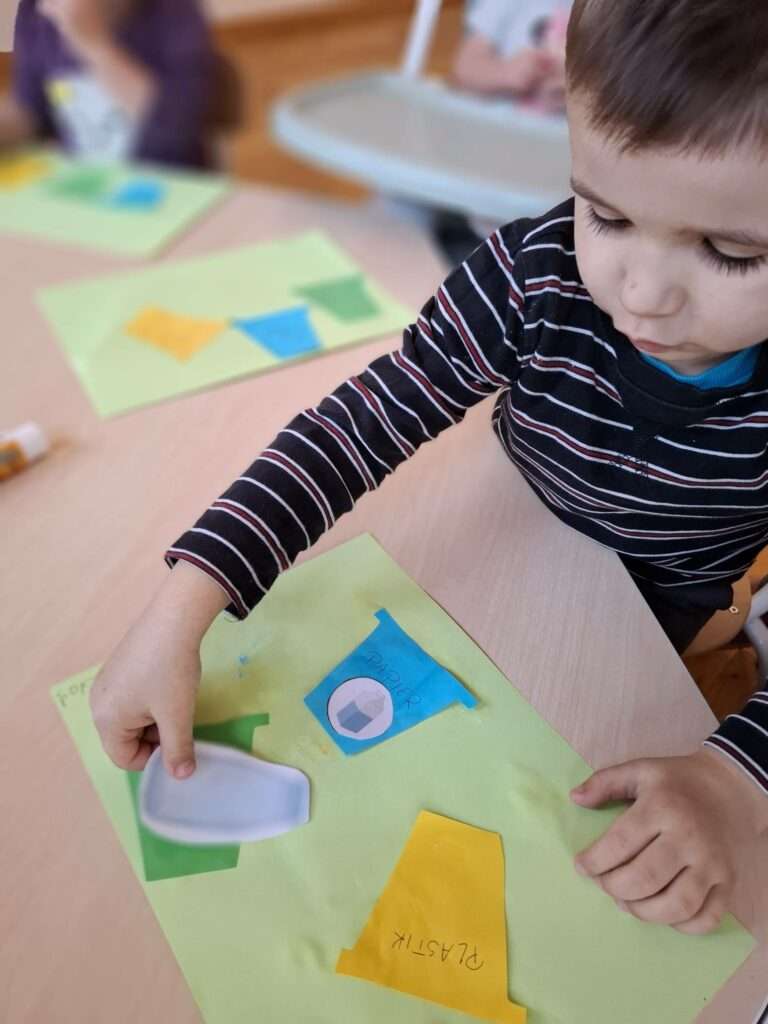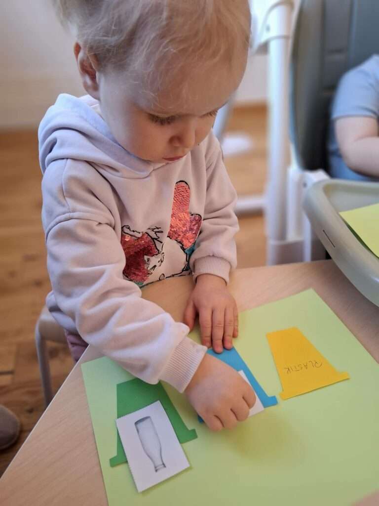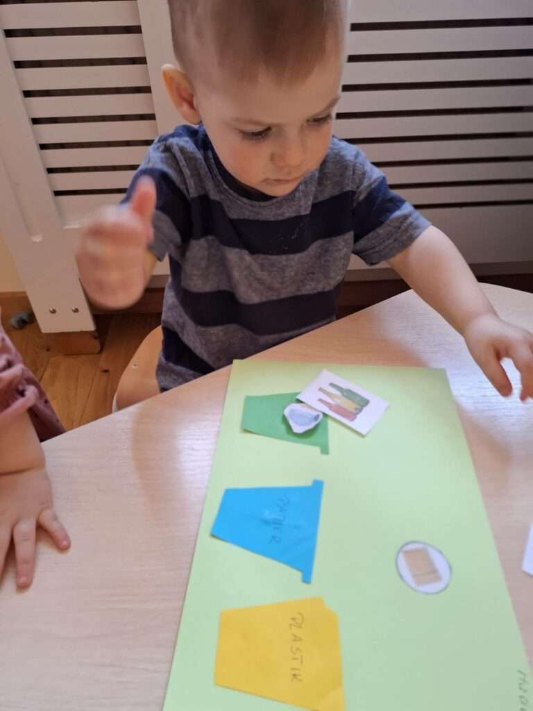 Dzieci utrwalały kolory oraz poznawały, do jakich pojemników wyrzucamy papier, szkło czy plastikowe butelki. Podczas aktywności przy stoliku, dopasowywały obrazki z odpadami do odpowiednich kolorowych koszy.
