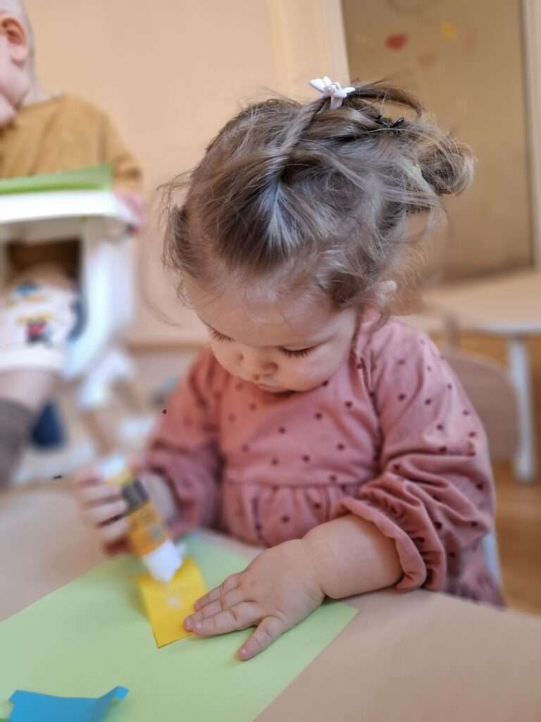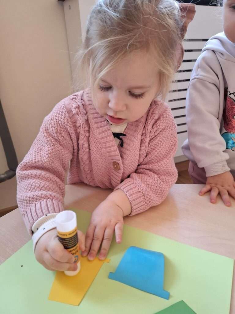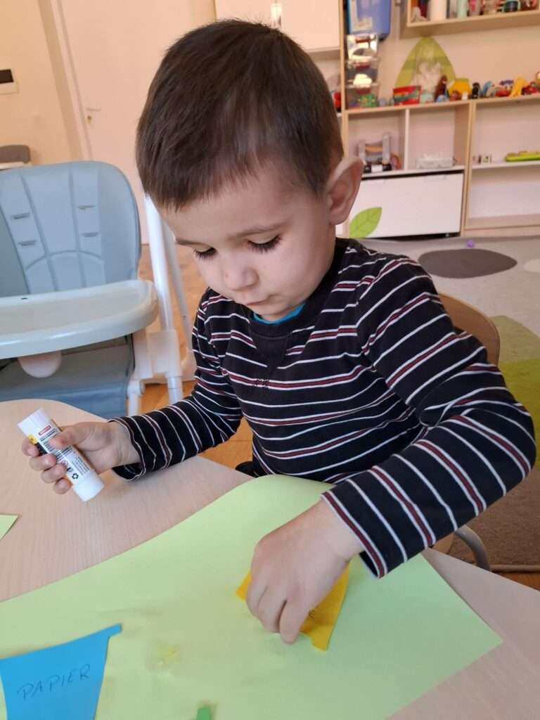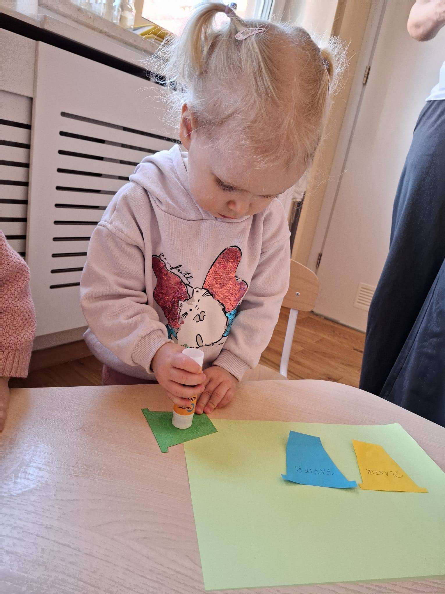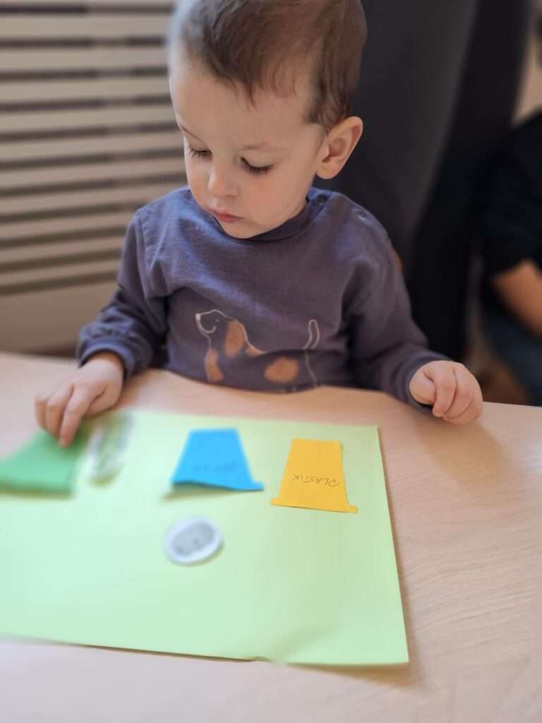 Dzieci utrwalały kolory oraz poznawały, do jakich pojemników wyrzucamy papier, szkło czy plastikowe butelki. Podczas aktywności przy stoliku, dopasowywały obrazki z odpadami do odpowiednich kolorowych koszy.