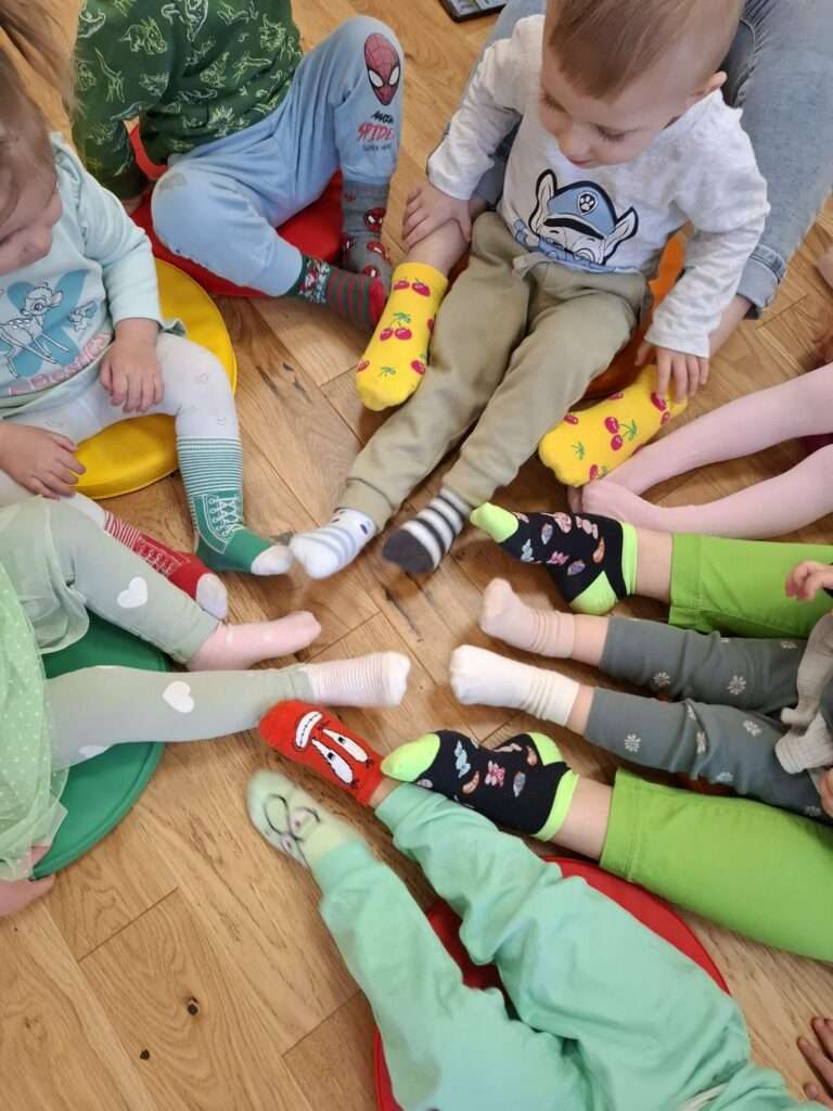 Symbolicznie założyliśmy kolorowe, nie do pary skarpetki, które są znakiem solidarności z osobami z zespołem Downa. Dzieci chętnie uczestniczyły w tej inicjatywie, a wspólne działania były okazją do budowania empatii i radości z bycia razem.