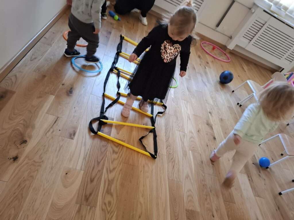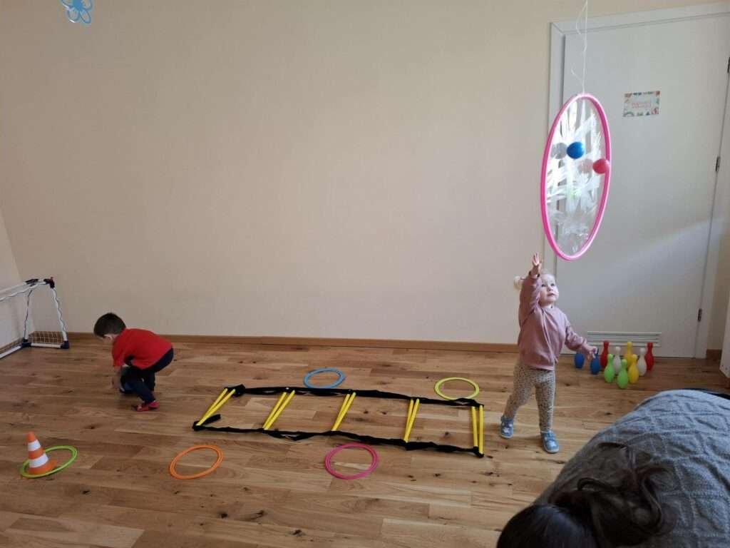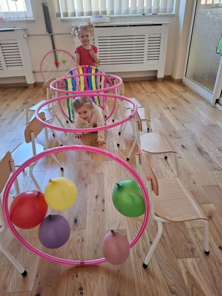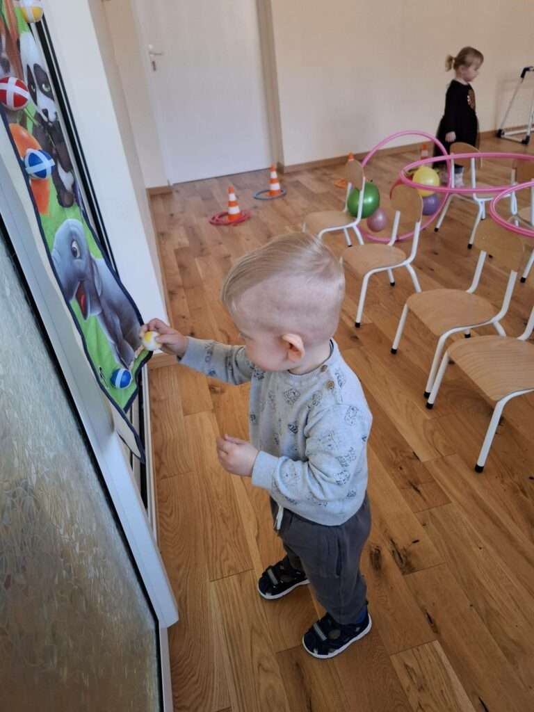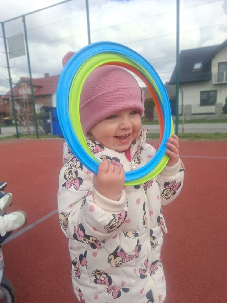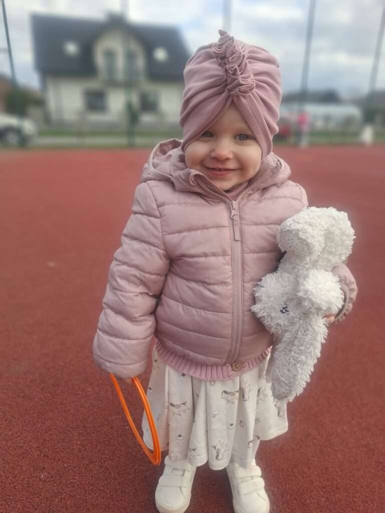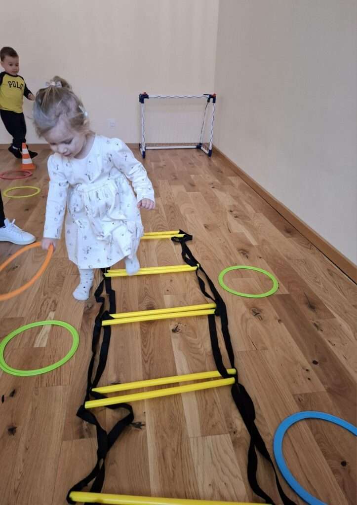 Maluchy z ogromną radością pokonywały kolorowy tor przeszkód – skakały przez obręcze, wspinały się, ćwiczyły celność z piłkami, obręczami, przeciskały się przez hula-hop… Na zakończenie przenieśliśmy się na świeże powietrze, gdzie mali sportowcy z zapałem strzelali gole do bramek.