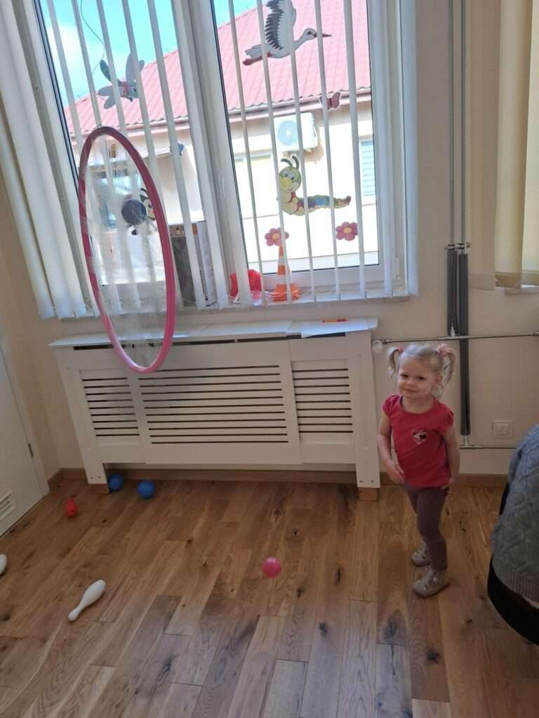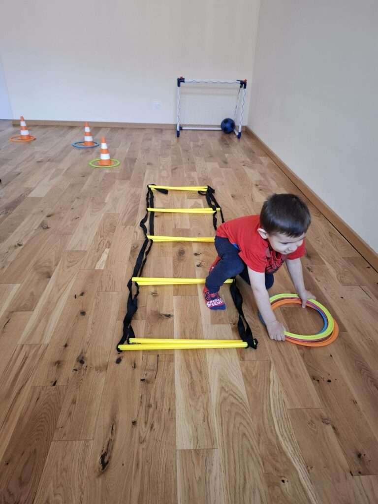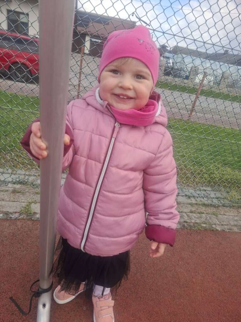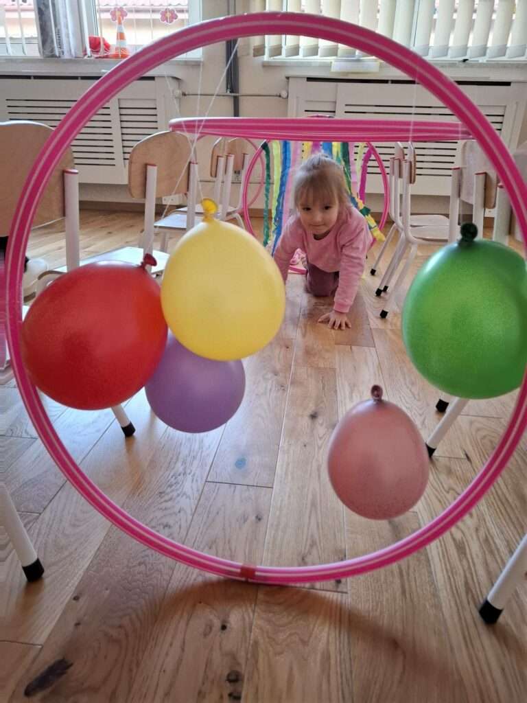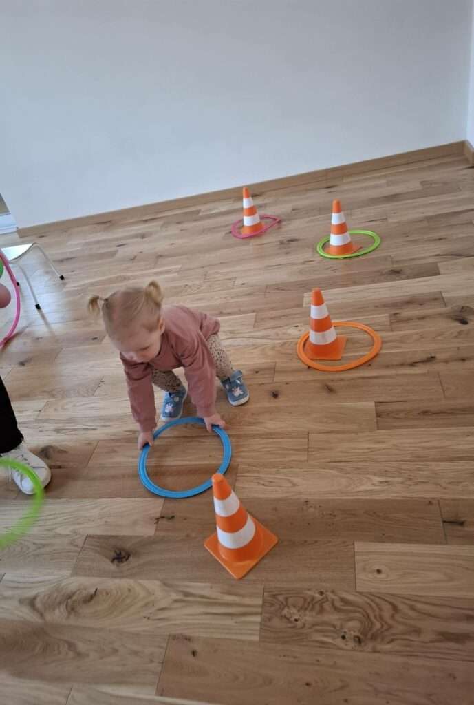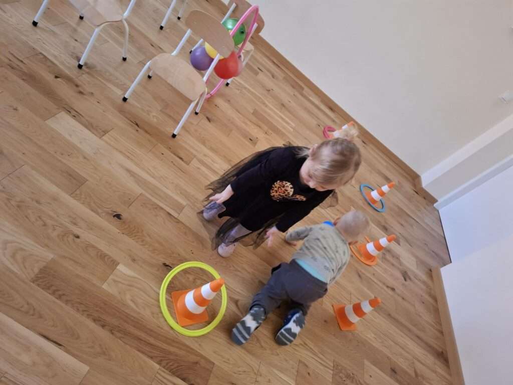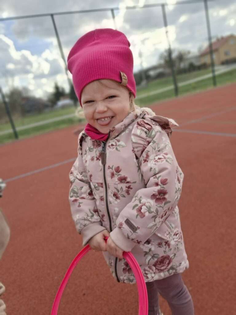Maluchy z ogromną radością pokonywały kolorowy tor przeszkód – skakały przez obręcze, wspinały się, ćwiczyły celność z piłkami, obręczami, przeciskały się przez hula-hop… Na zakończenie przenieśliśmy się na świeże powietrze, gdzie mali sportowcy z zapałem strzelali gole do bramek.