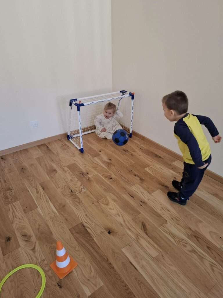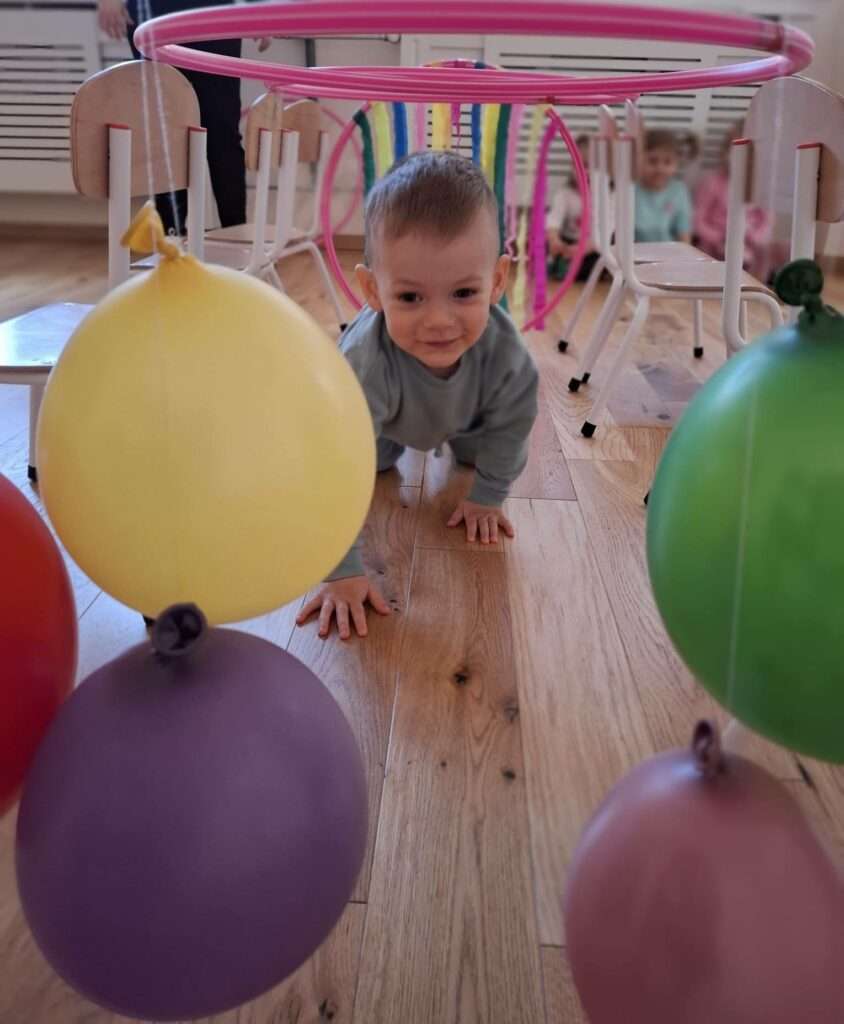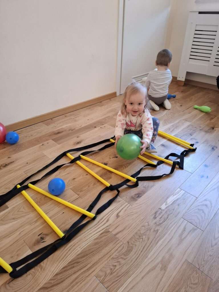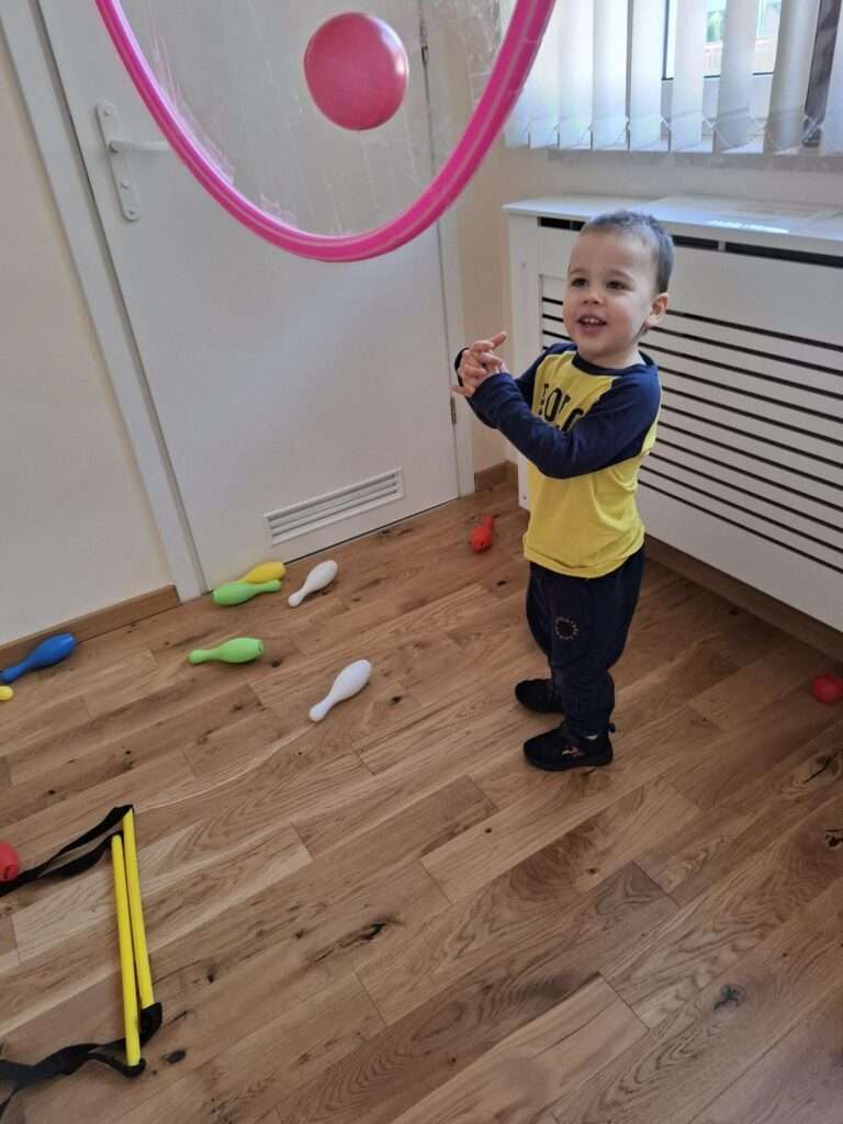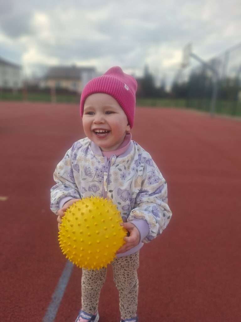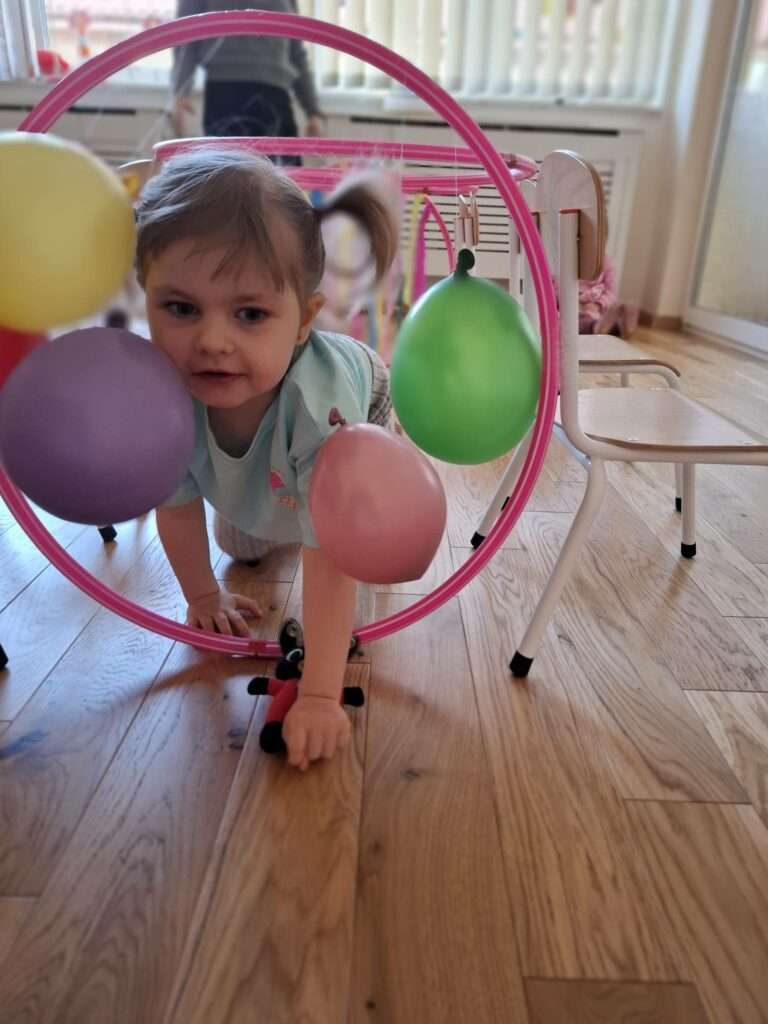 Maluchy z ogromną radością pokonywały kolorowy tor przeszkód – skakały przez obręcze, wspinały się, ćwiczyły celność z piłkami, obręczami, przeciskały się przez hula-hop… Na zakończenie przenieśliśmy się na świeże powietrze, gdzie mali sportowcy z zapałem strzelali gole do bramek.