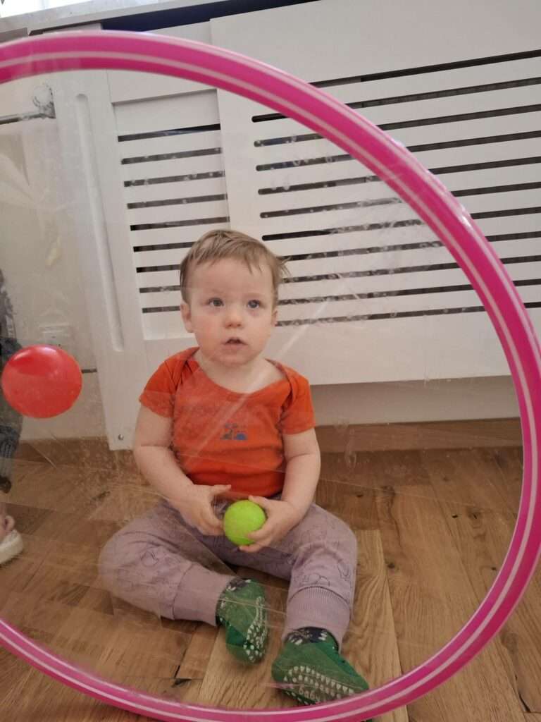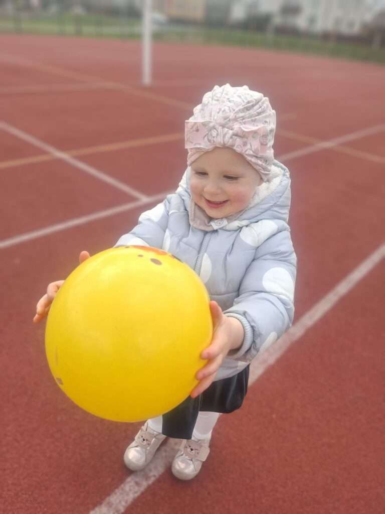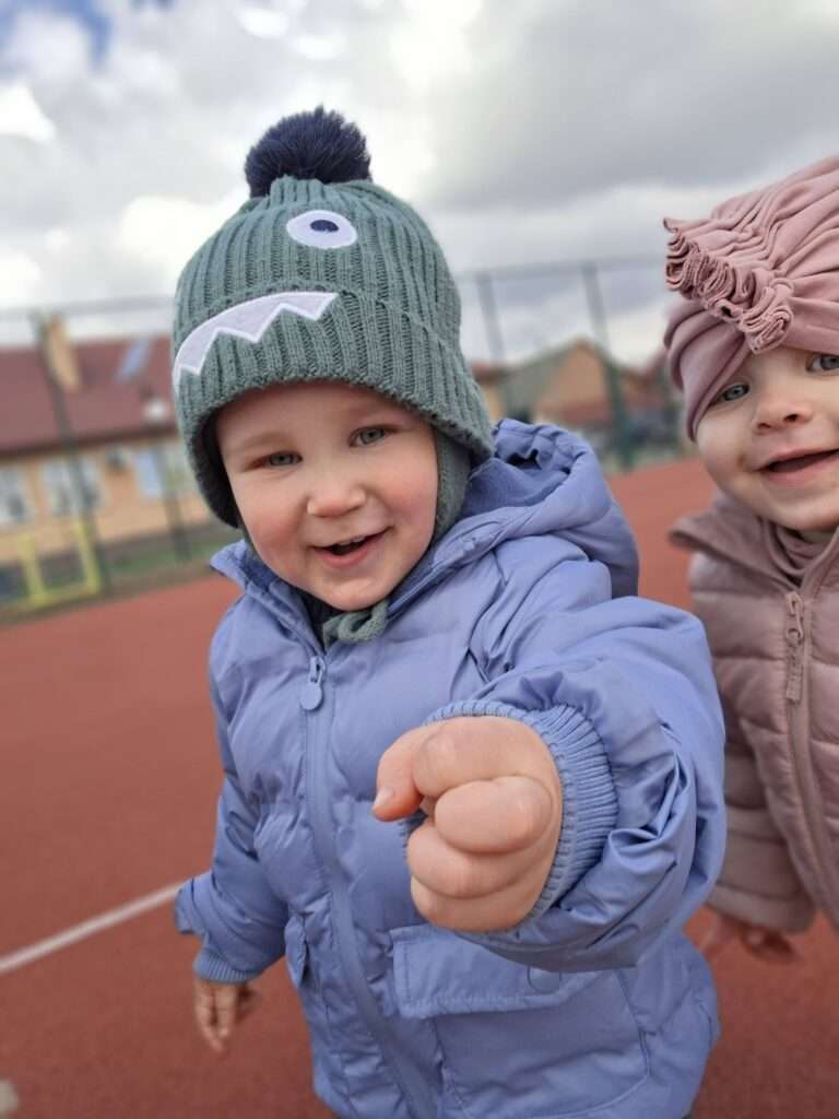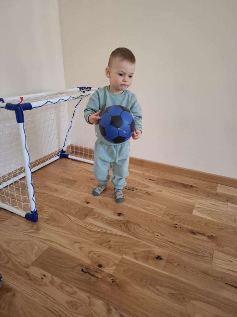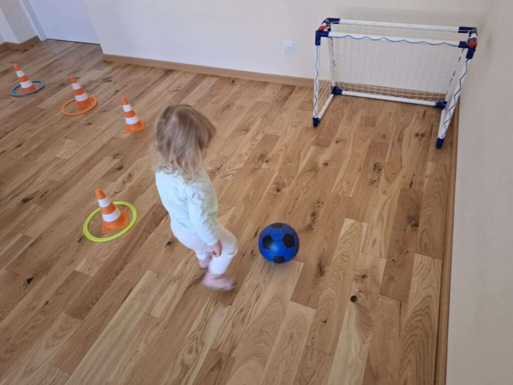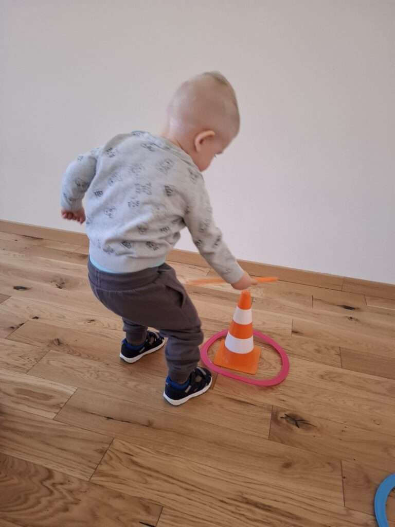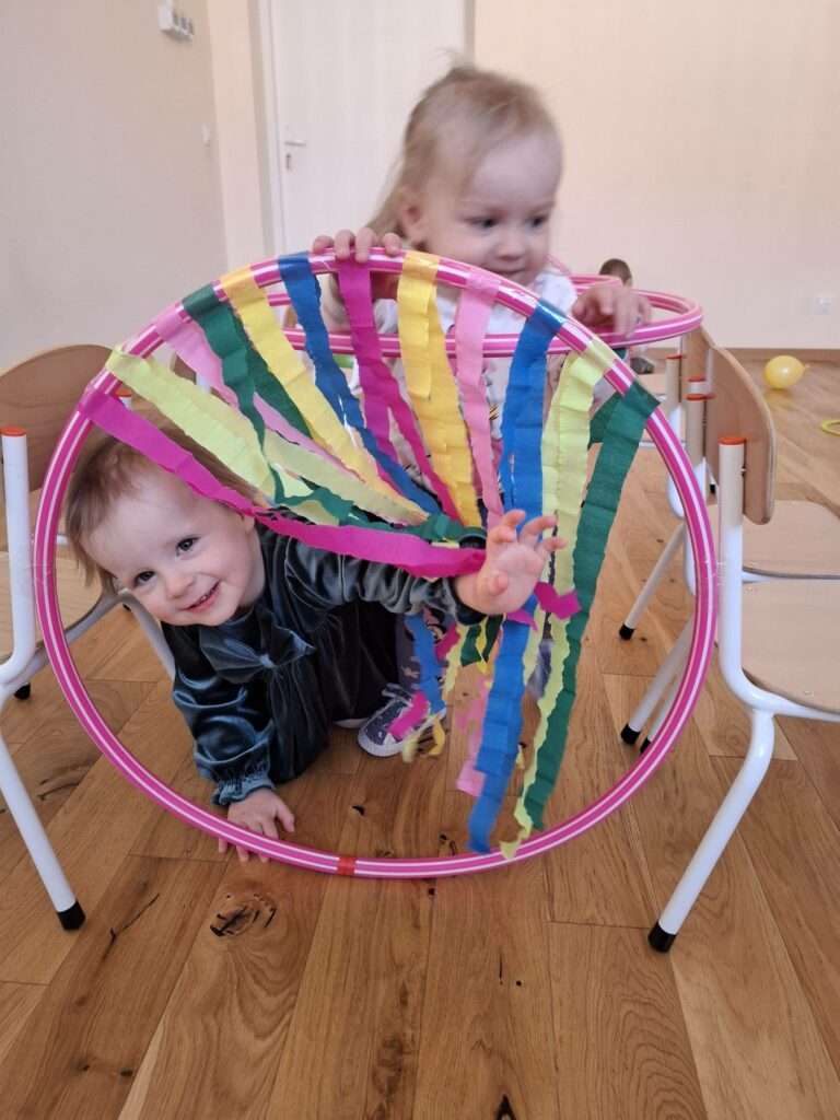 Maluchy z ogromną radością pokonywały kolorowy tor przeszkód – skakały przez obręcze, wspinały się, ćwiczyły celność z piłkami, obręczami, przeciskały się przez hula-hop… Na zakończenie przenieśliśmy się na świeże powietrze, gdzie mali sportowcy z zapałem strzelali gole do bramek.