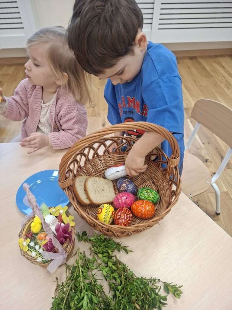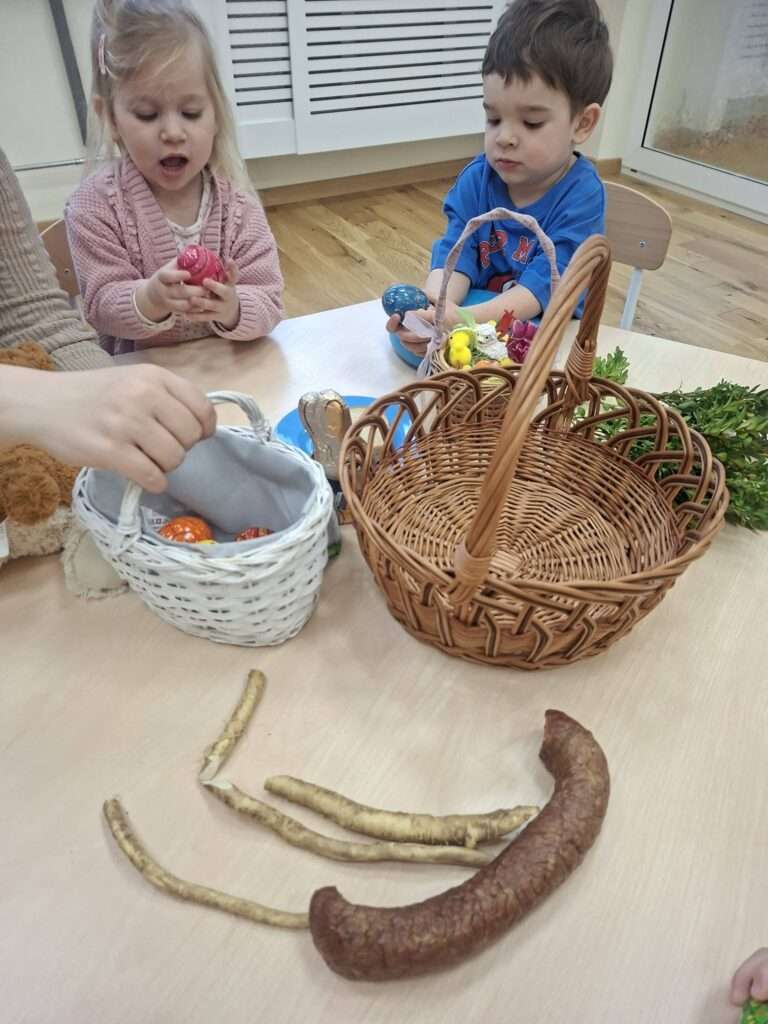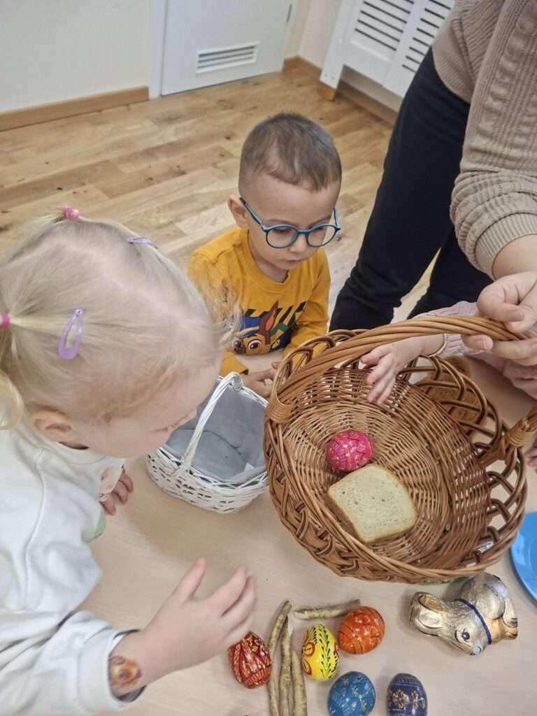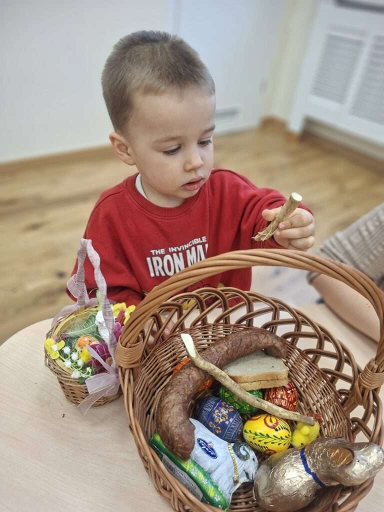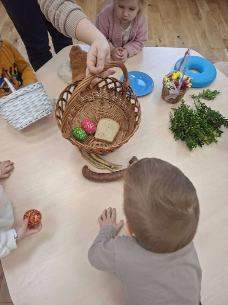 W ramach przygotowań do Wielkanocy zaglądaliśmy wspólnie do koszyczka wielkanocnego i sprawdzaliśmy, co powinno się w nim znaleźć. Dzieci z ciekawością poznawały jego zawartość – były pisanki, kiełbasa, sól, chleb oraz baranek wielkanocny.
