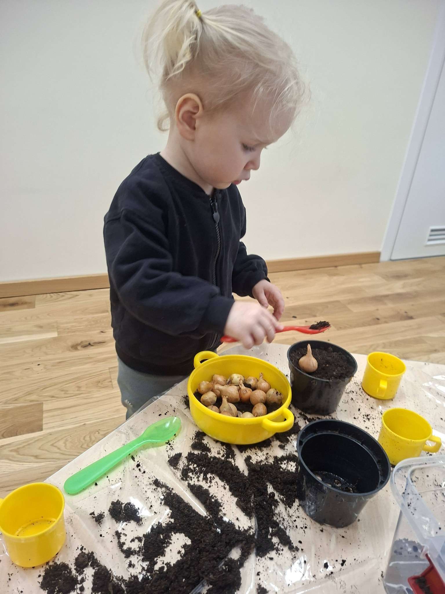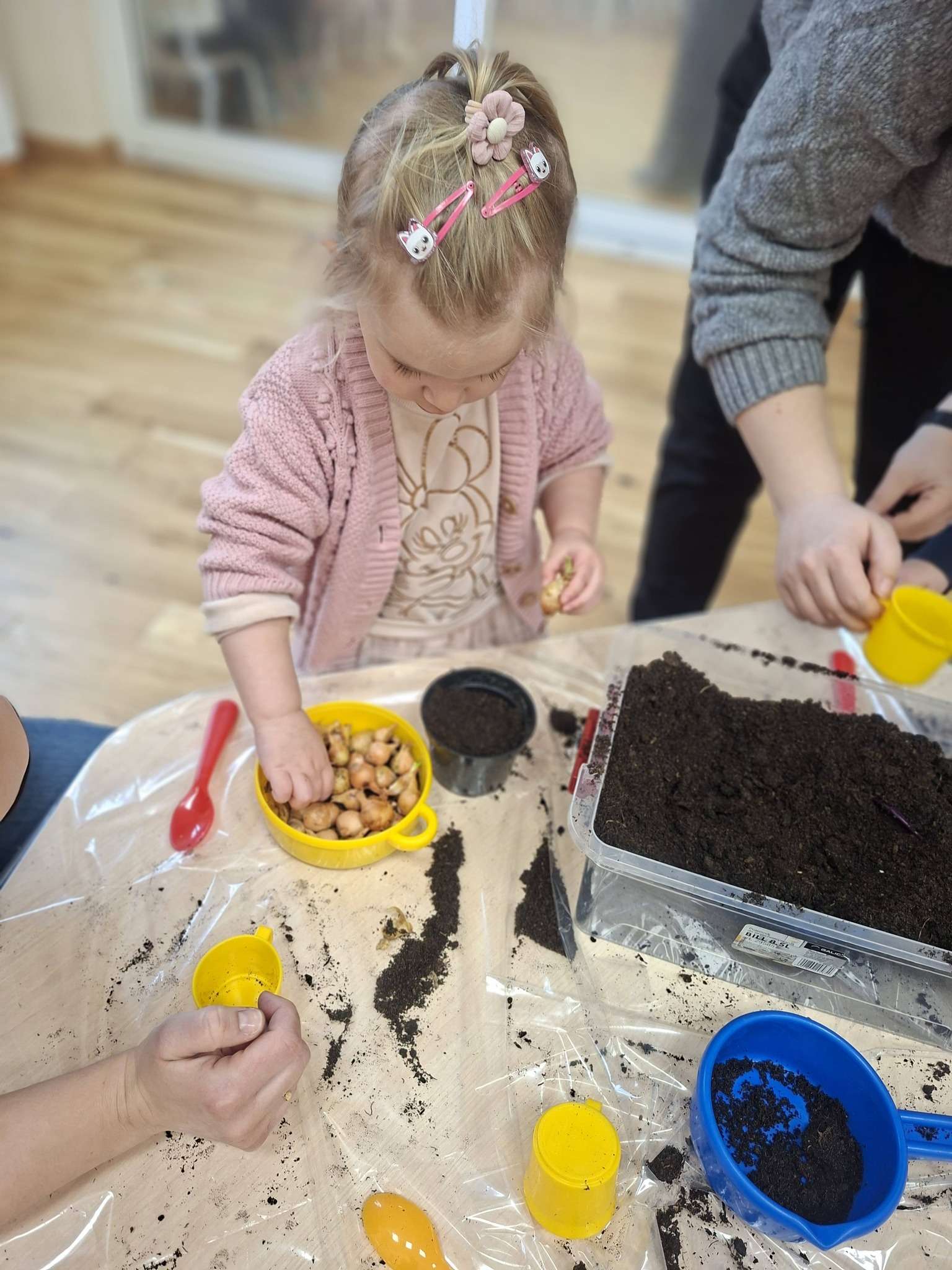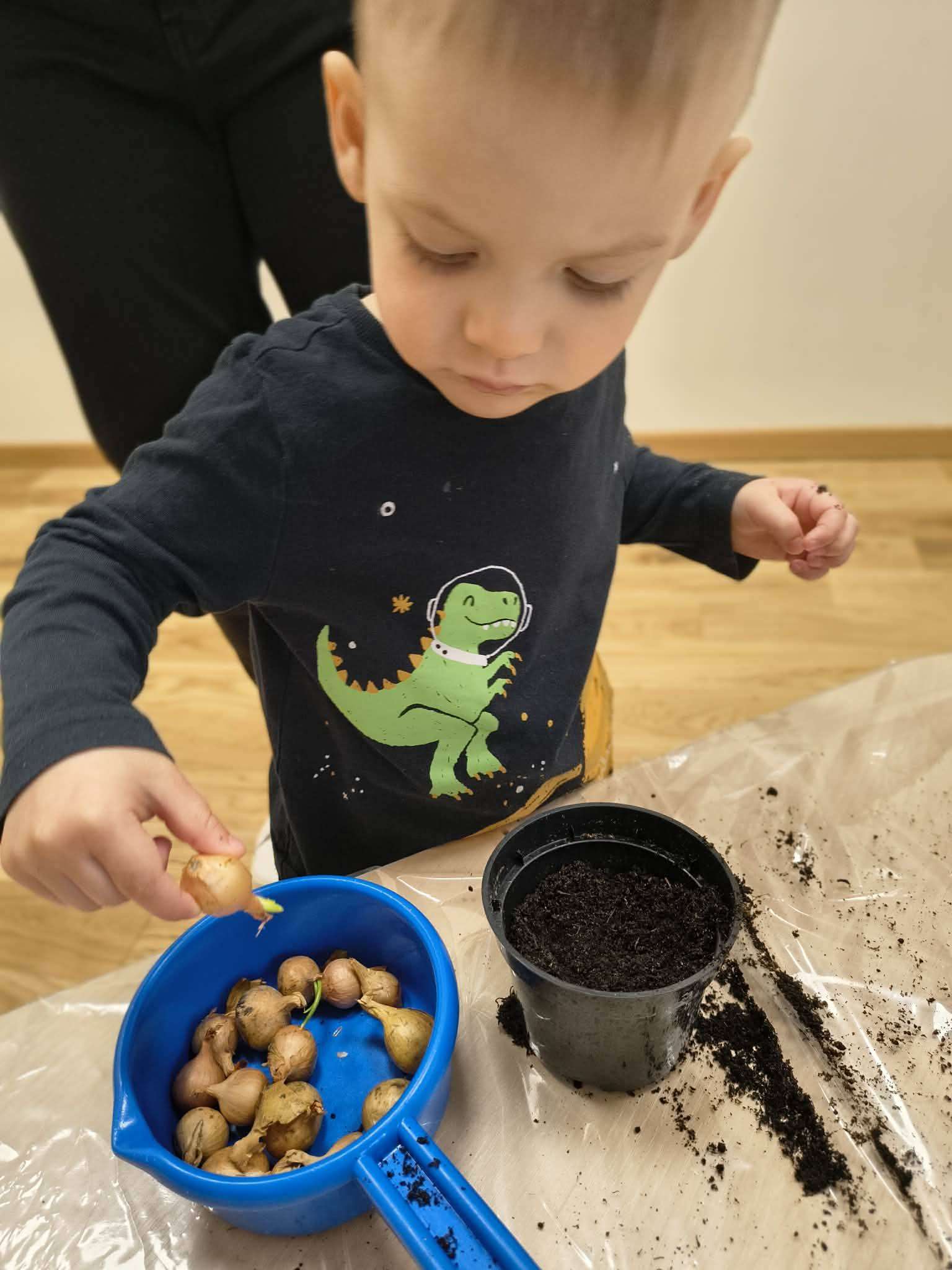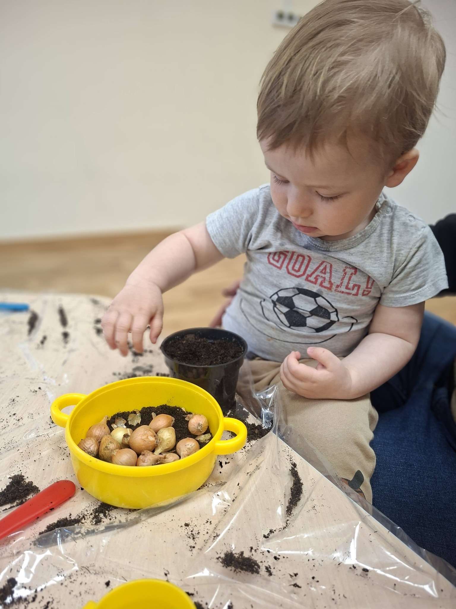 Z tych małych cebulek już niedługo wyrośnie zielony szczypiorek. To była świetna okazja do poznawania przyrody, rozwijania małej motoryki oraz nauki cierpliwości – teraz będziemy obserwować, jak nasze roślinki rosną.![]()