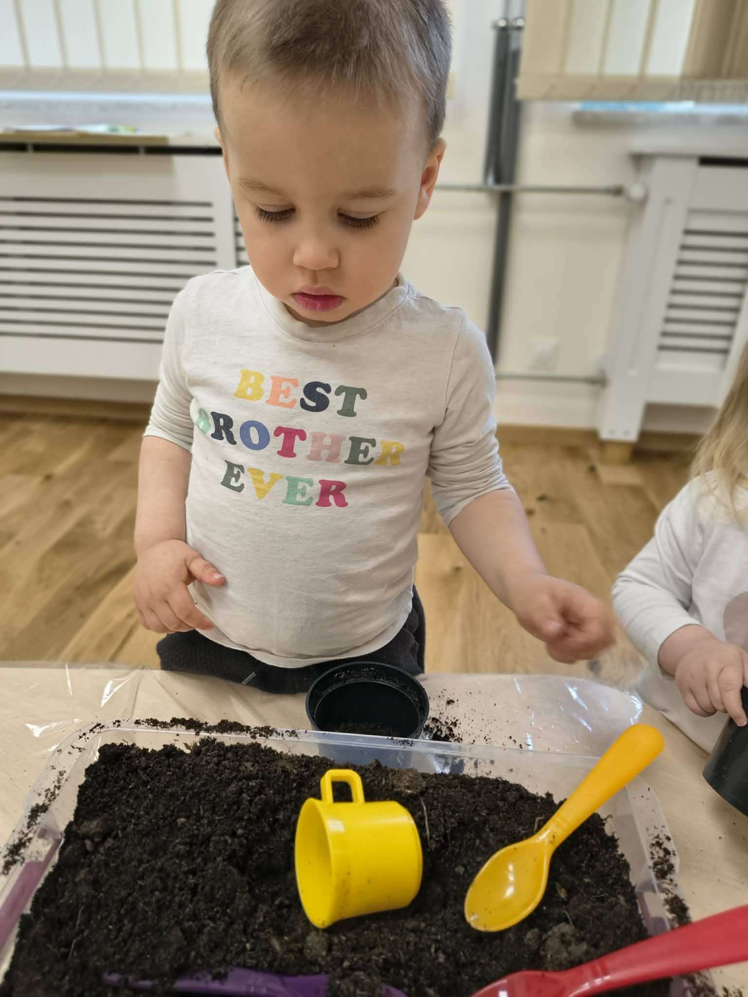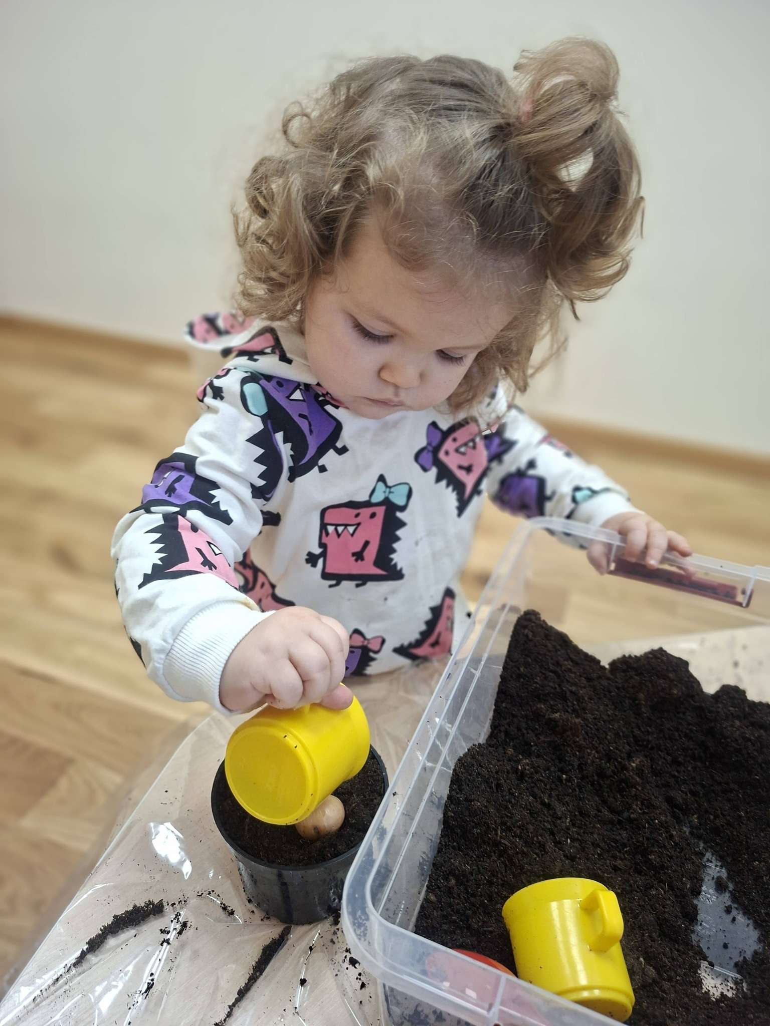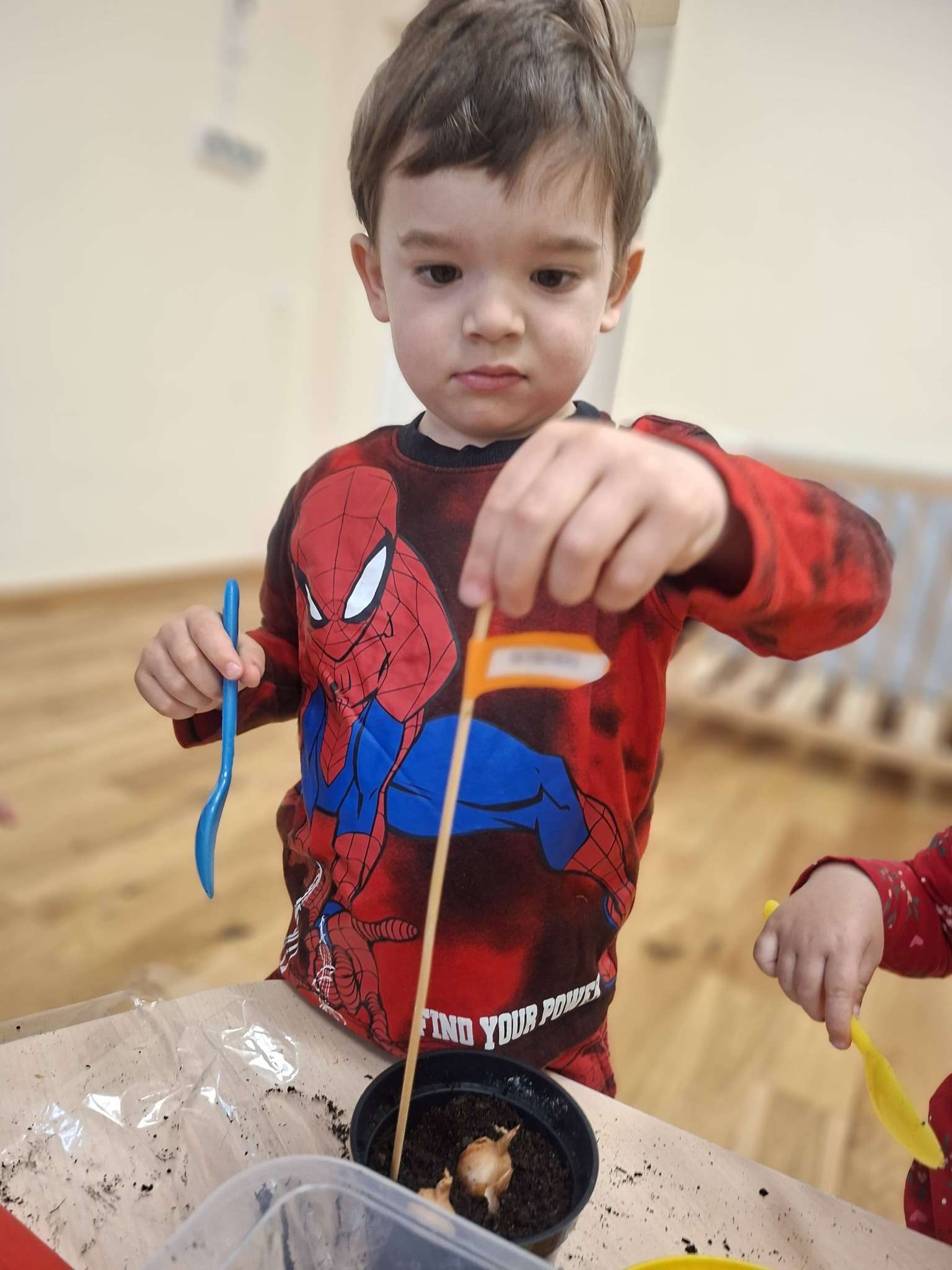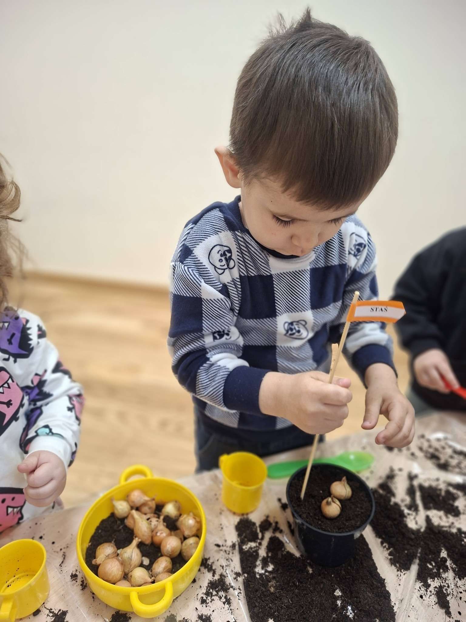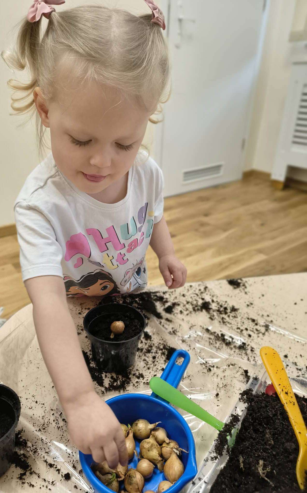 Z tych małych cebulek już niedługo wyrośnie zielony szczypiorek. To była świetna okazja do poznawania przyrody, rozwijania małej motoryki oraz nauki cierpliwości – teraz będziemy obserwować, jak nasze roślinki rosną.![]()