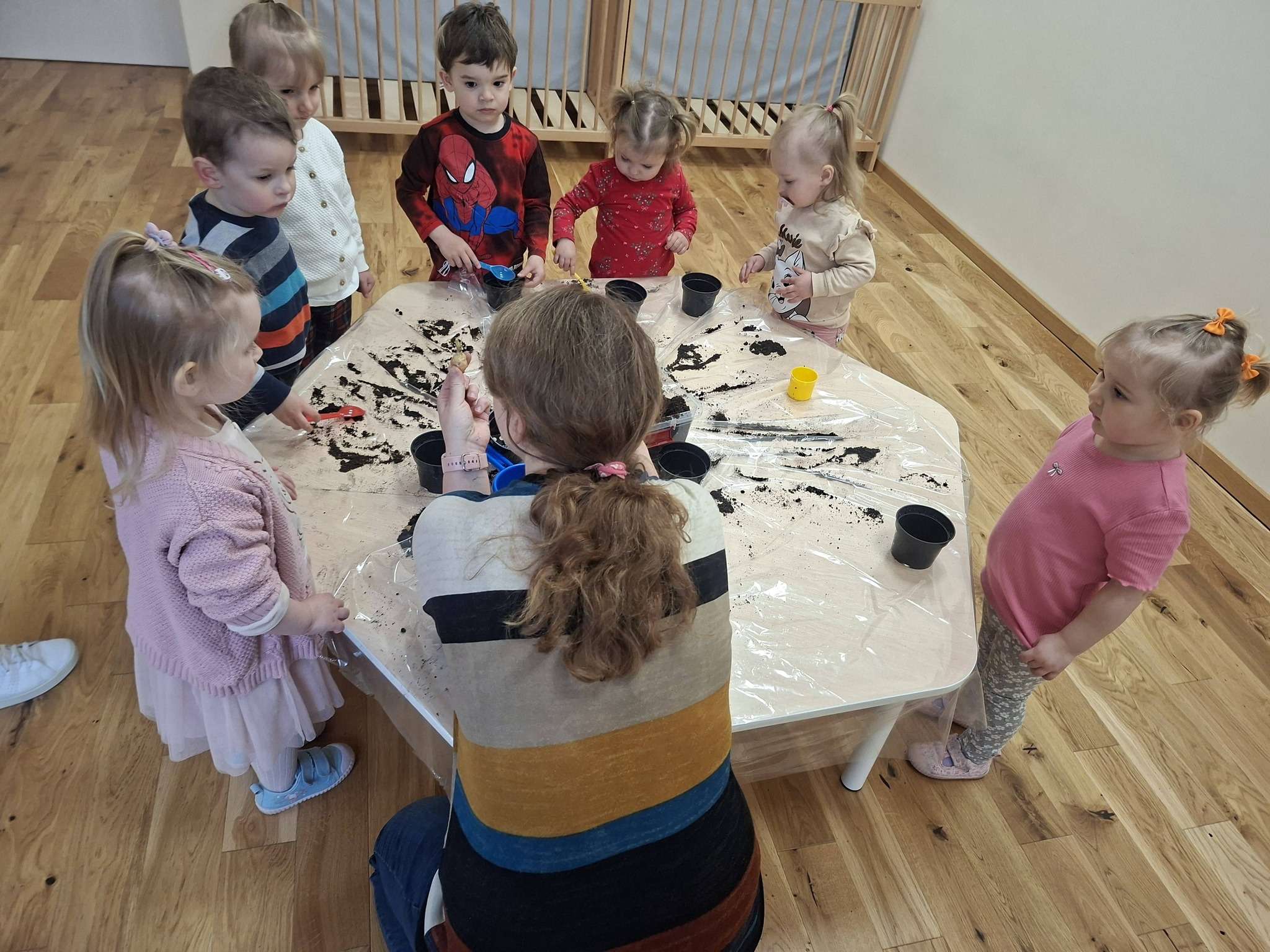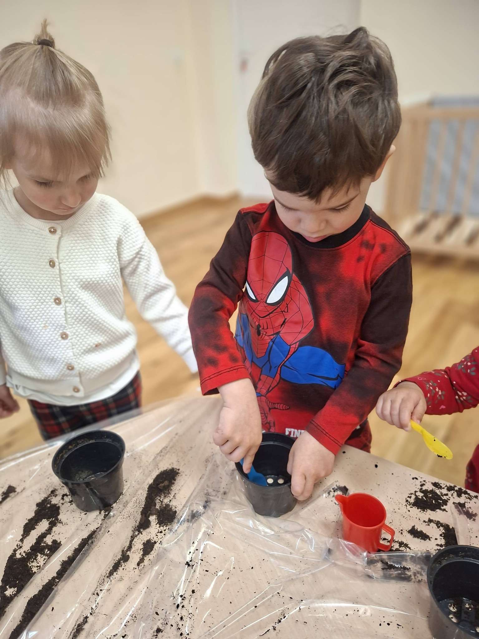 Dzieci wzięły udział w zajęciach przyrodniczo–ogrodniczych. Każde dziecko samodzielnie wsypywało ziemię do doniczki, a następnie sadziło cebulkę.